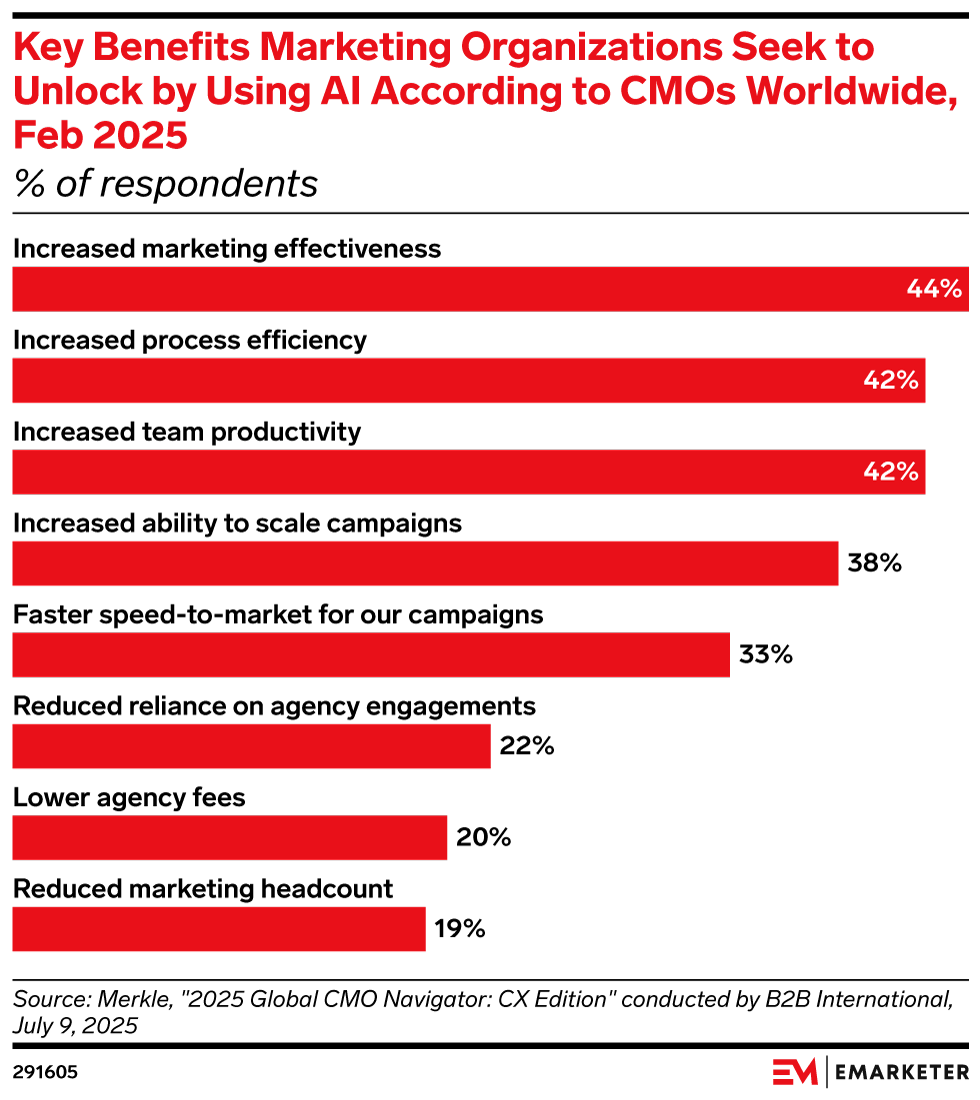 Some CMOs see AI as a reason to bring more work in-house, with 22% citing reduced reliance on external agencies and 20% pointing to lower fees. Instead of sidelining agencies, this shift recasts their role—away from execution and toward higher-value creative and advisory work. That evolution is already visible: Mastercard, for instance, chose WPP Media in part for its AI capabilities.