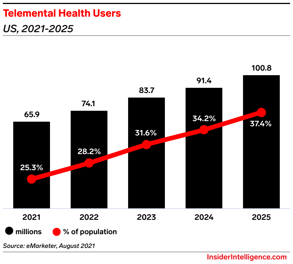 • In fact, Insider Intelligence expects telemental health users to skyrocket from 74 million consumers this year to nearly 101 million consumers by 2025.