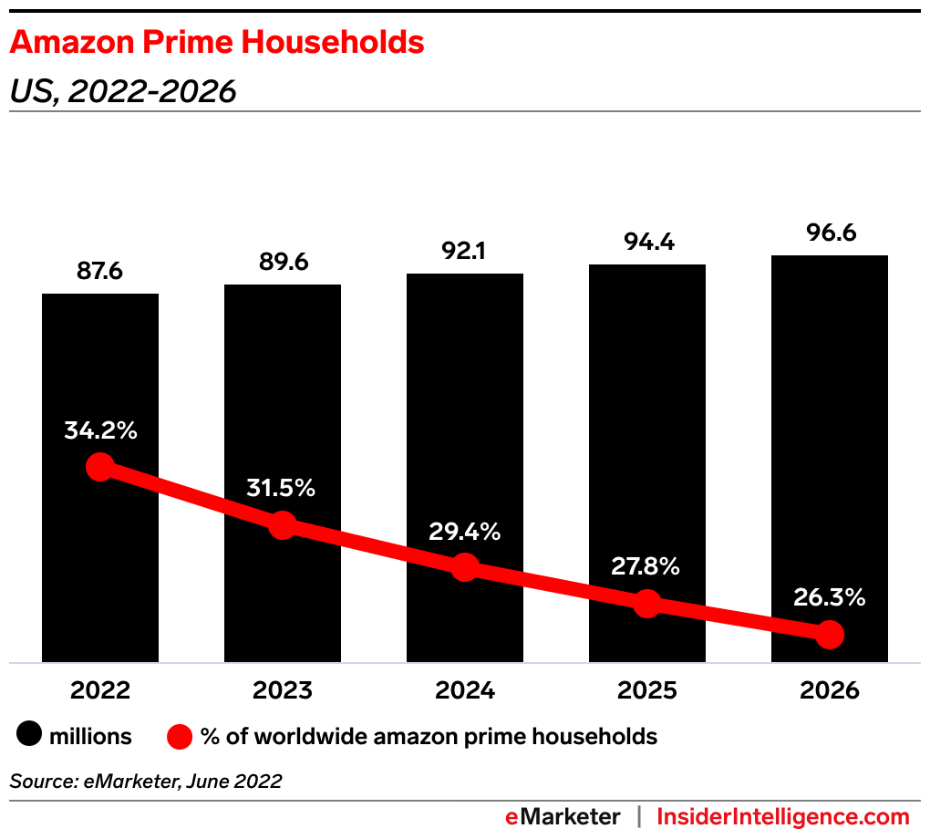 • More than half the US population—172 million people—are Prime members, according to Consumer Intelligence Research Partners. Over two-thirds of US households (67%) subscribe to Prime, per our estimates.