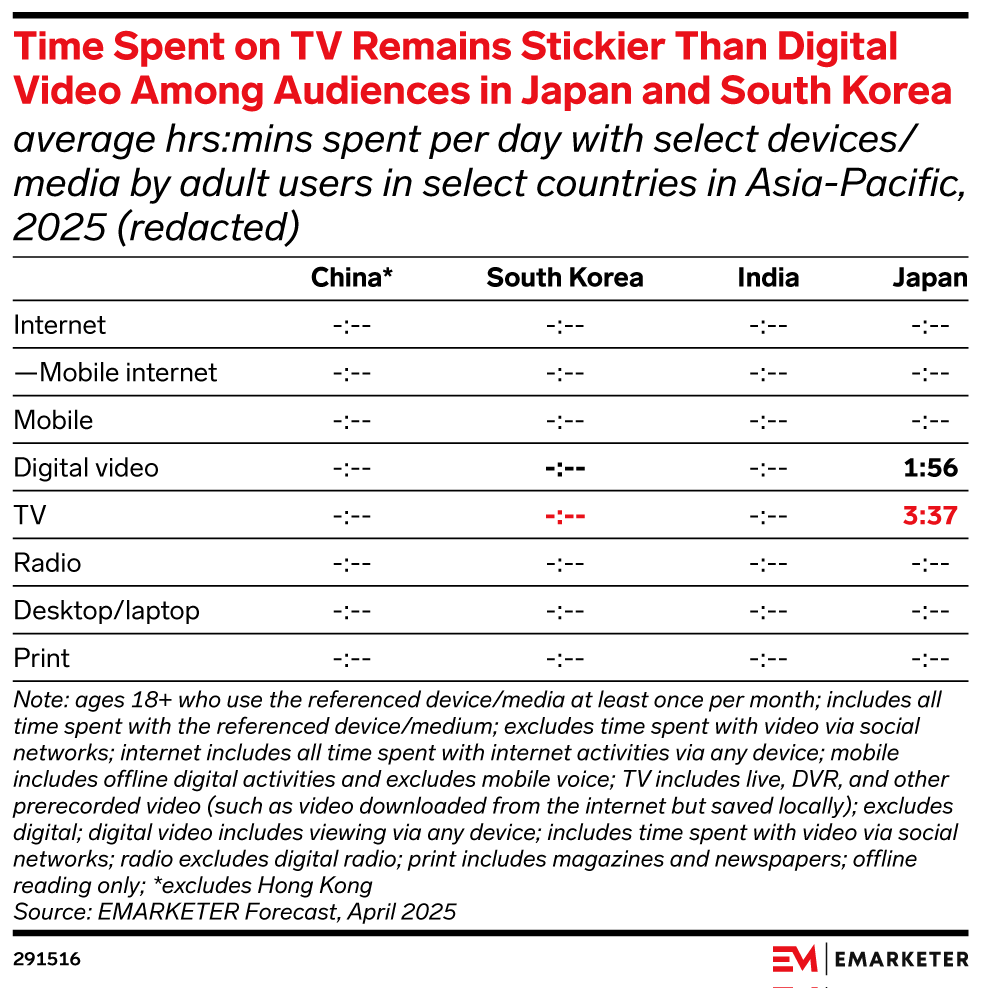 Key Stat: TV viewers in Japan and South Korea will spend 3 hours, 37 minutes (3:37) and 3:19, respectively, on TV daily in 2025. That’s more time than digital video viewers from each country will spend on digital video.