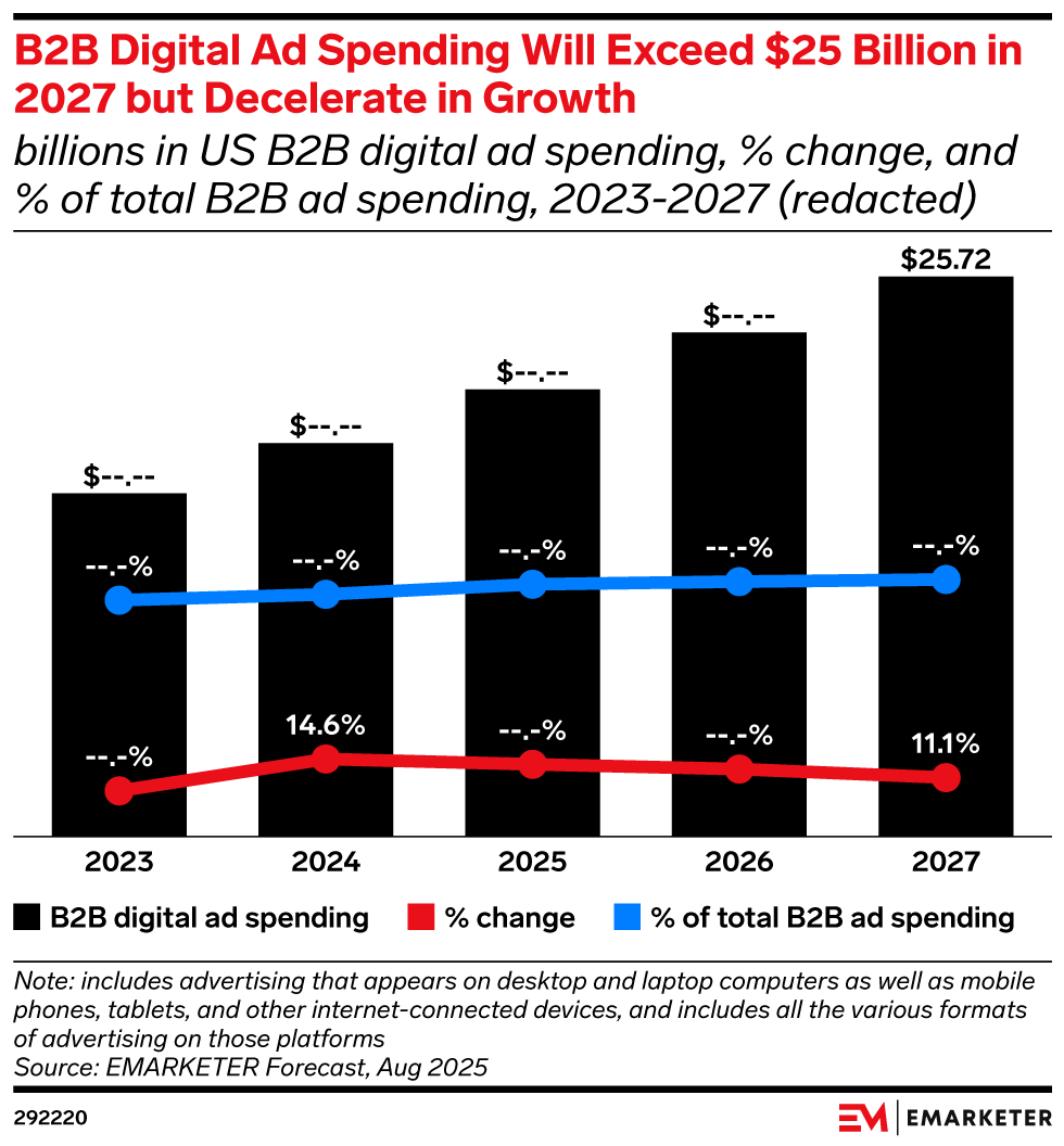 Key Stat: US B2B digital ad spending growth will slow from 14.6% YoY in 2024 to 11.1% in 2027, when spend will reach $25.72 billion.