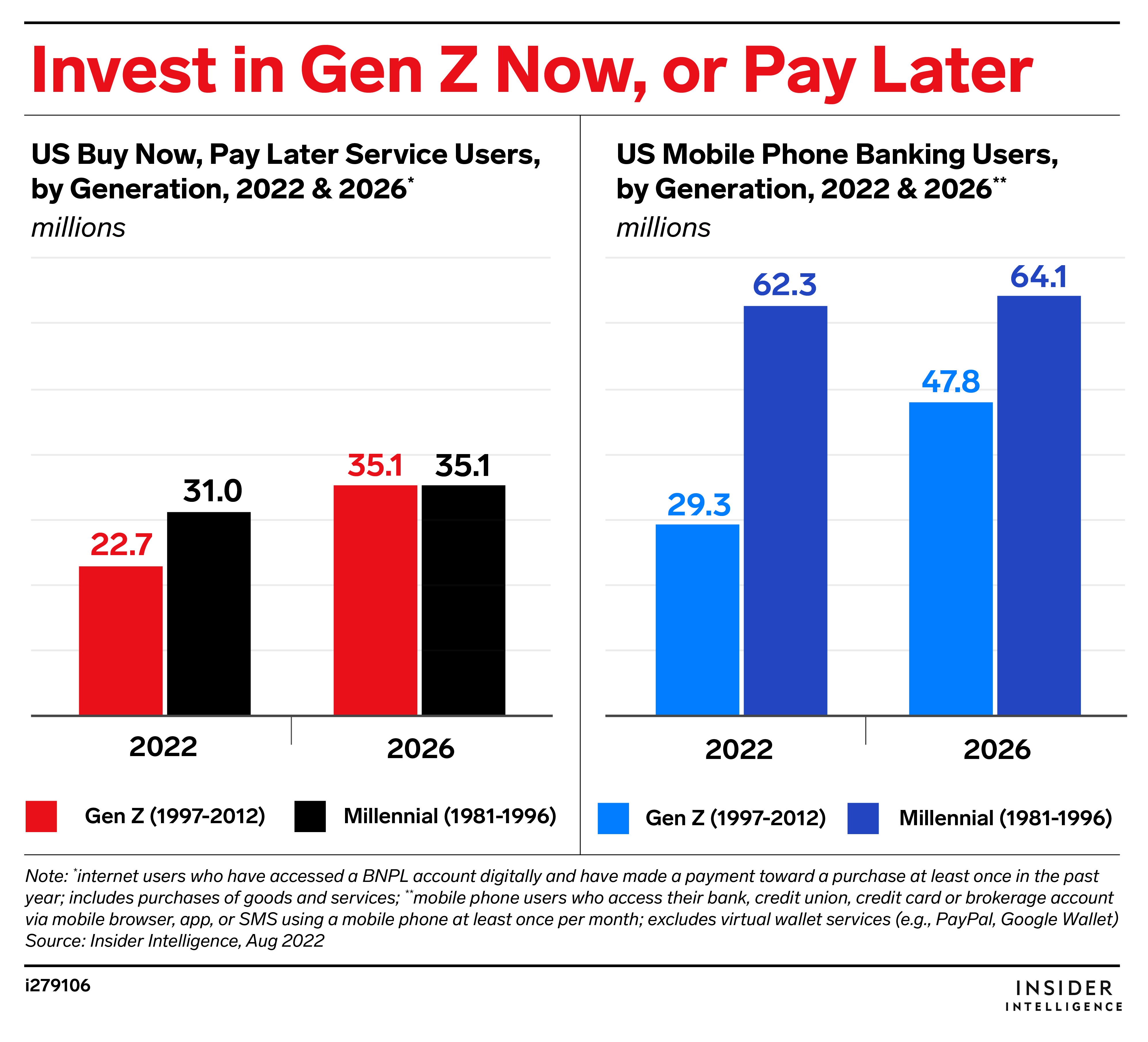 Gen Z is the new customer—and their business must be won today. In 2023, there will be more adult Gen Zers than adolescents for the first time—about half the size of the millennial population. This digitally native generation relies heavily on digital for their finances, and that won’t change. Players across the banking sphere must act now to grab adult Gen Zers’ business, while also trying to win over younger consumers and lay the groundwork for upselling them in the future.