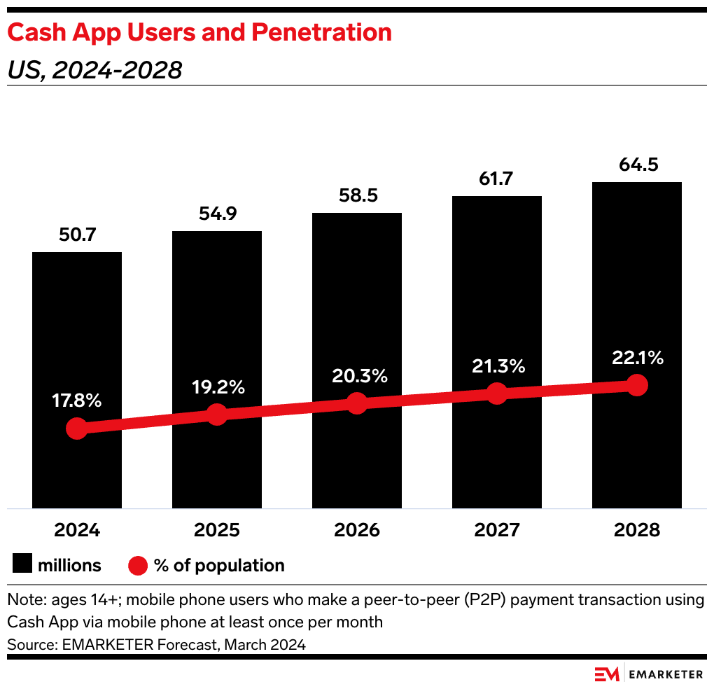 How we got here: Block’s focus for the last year has been what it calls “banking our base.” CEO Jack Dorsey wants to turn the 54.9 million people we forecast will use Cash App this year into users who take advantage of Block’s full suite of consumer banking products.