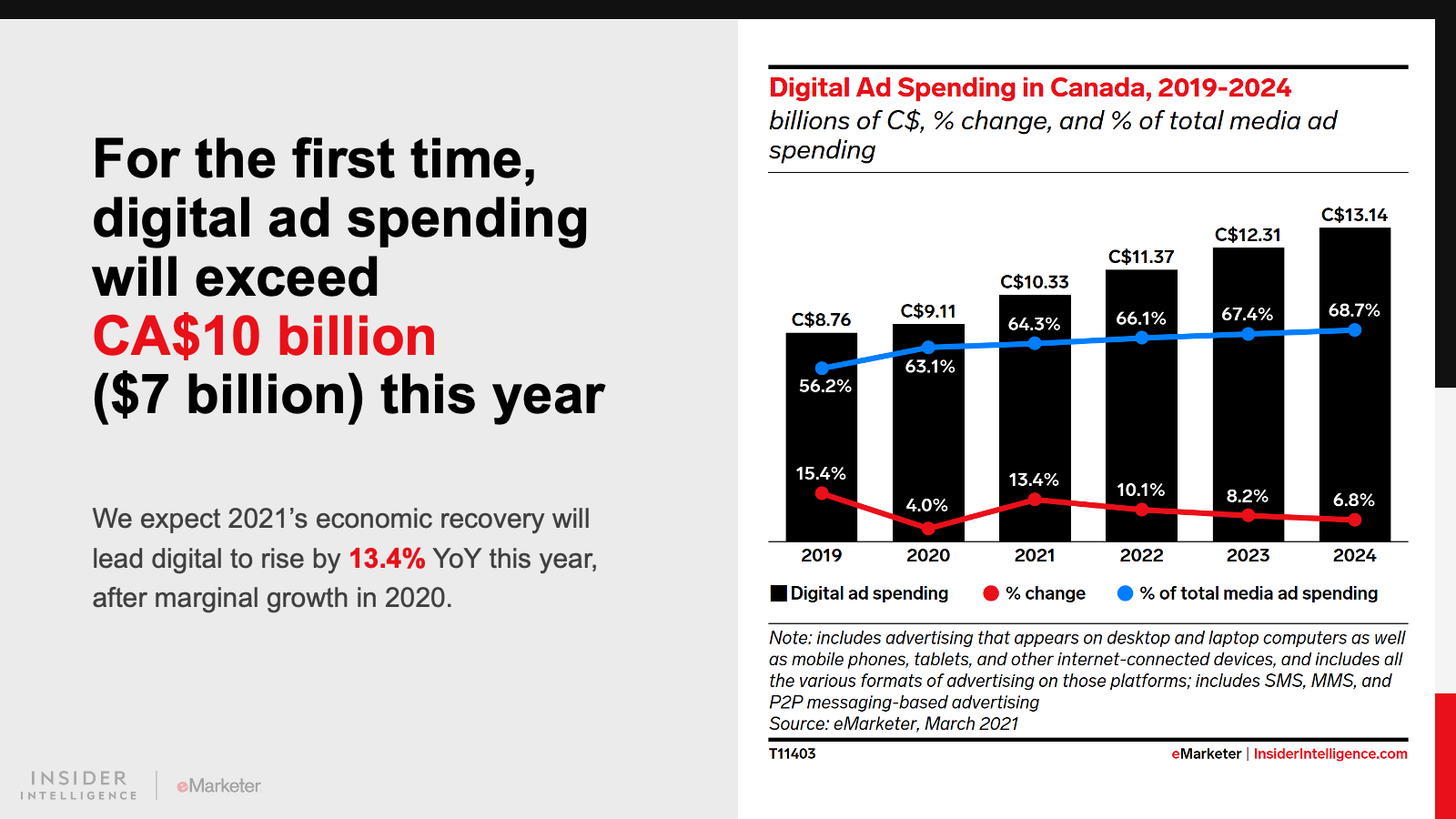 KEY STAT: Digital ad spending in Canada will surpass CA$10 billion ($7 billion) this year, accounting for 64.3% of total media ad spending.