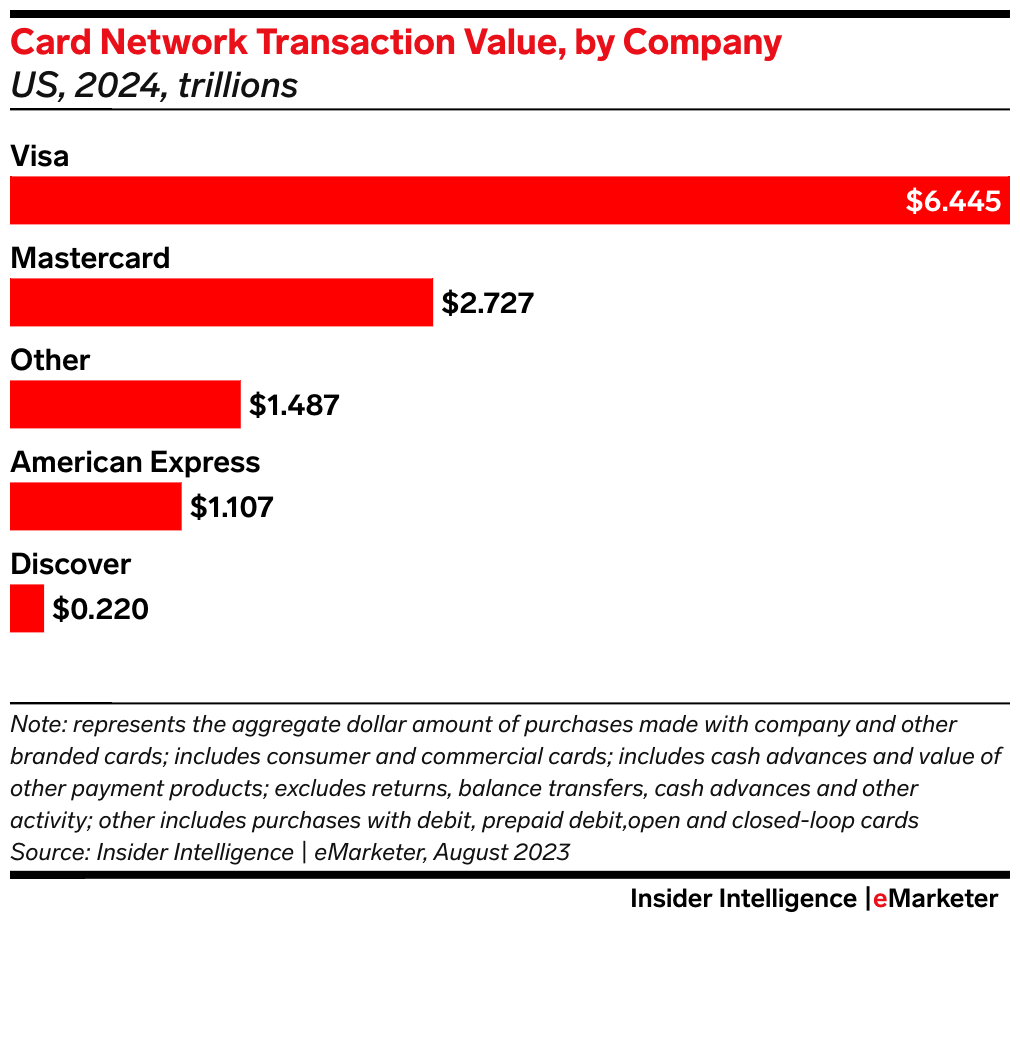 Currently, Discover accounts for only 1.8% of US card network transaction value, per our forecasts, compared with Visa’s 53.8% and Mastercard’s 22.8% shares.