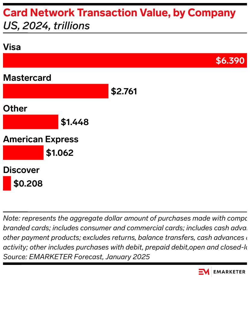 One of the biggest changes will be to the card network landscape. Capital One will switch some of its cards from Visa’s and Mastercard’s networks to the Discover network. This will shift competitive dynamics. Given most of Capital One’s volume is on the Mastercard network, it would more so affect Mastercard than Visa. This could widen Visa’s lead as the largest card network. And if Capital One converted nearly all of its credit and debit cards to Discover, it may also push the network past American Express, which was more than five times its size in 2024, per our forecasts.