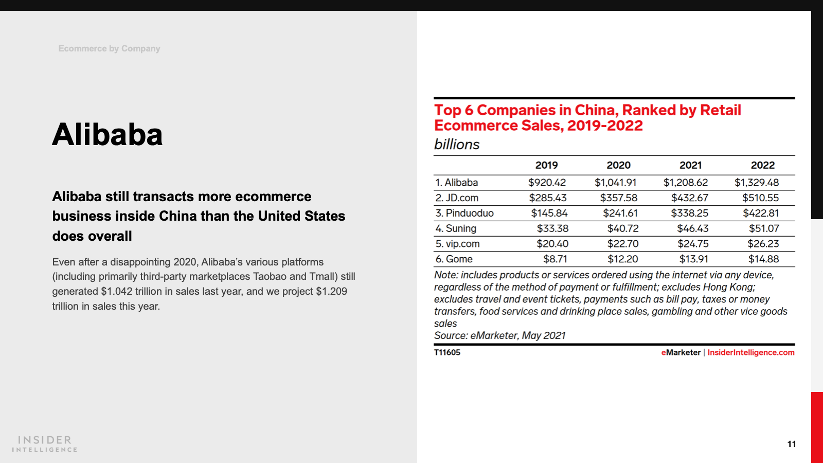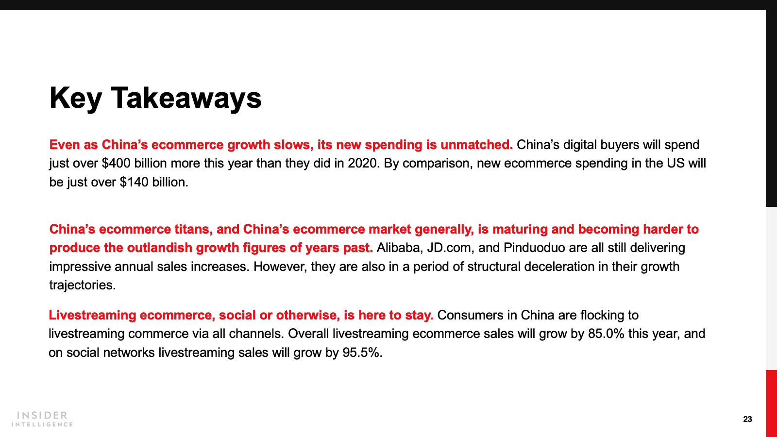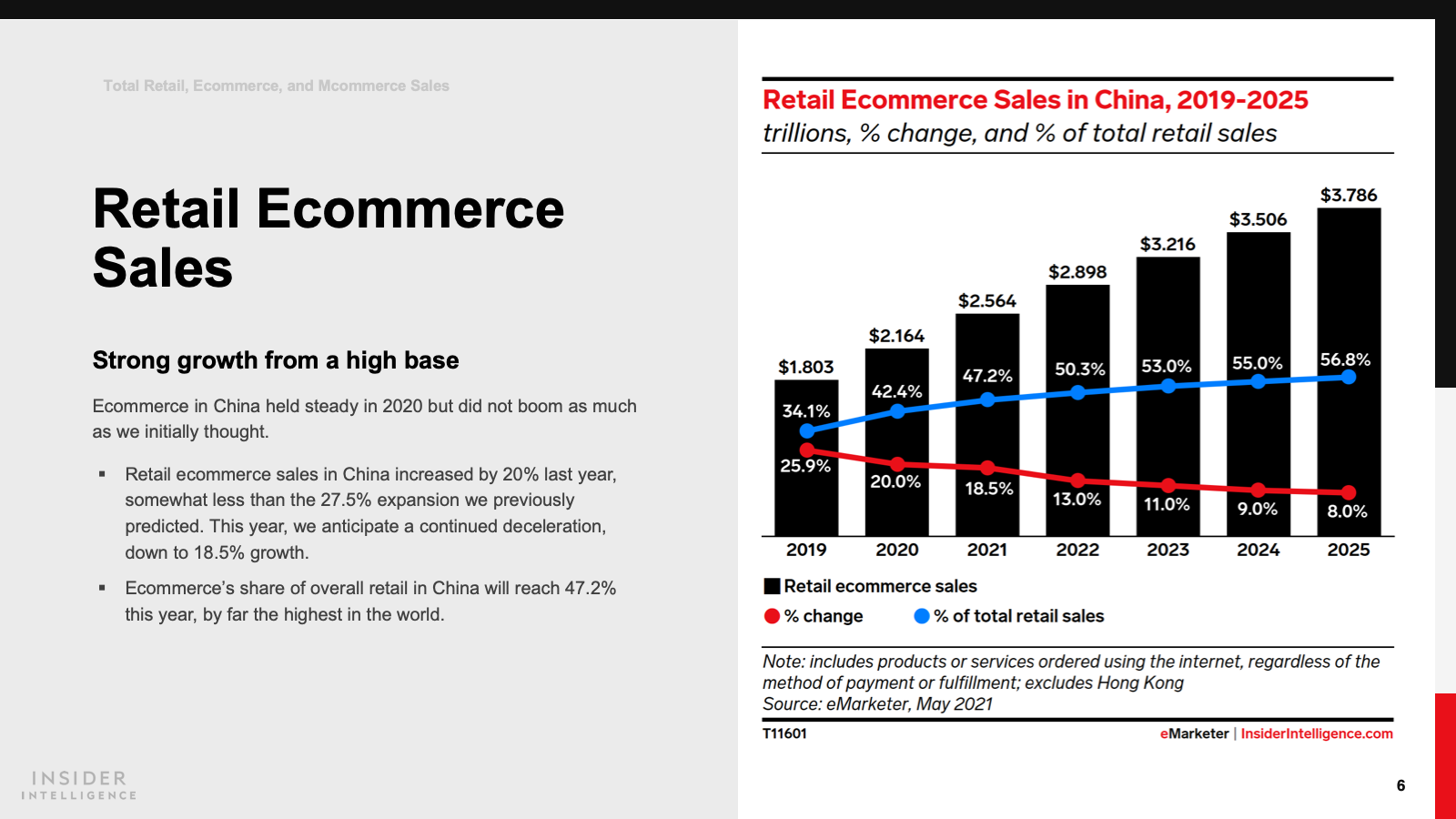 KEY STAT: Retail ecommerce sales in China increased by 20% last year, less than the 27.5% expansion we previously predicted. This year, we anticipate a continued deceleration, down to 18.5% growth.