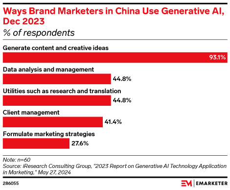Among marketers in China, content and creative ideas generation is the most popular genAI use case, according to a May 2024 iResearch Consulting Group survey.