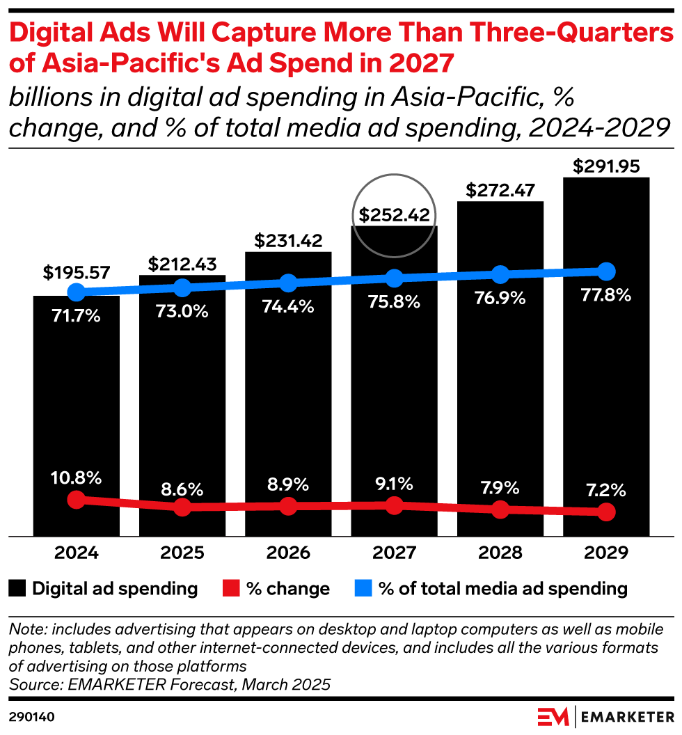 Digital ad spending in Asia-Pacific is forecast to grow 8.6% in 2025, reaching $212.43 billion and accounting for 73.0% of total media ad expenditures—a measure by which it trails only North America. In comparison, Asia-Pacific’s total media ad spending will expand by 6.6% in 2025, reaching $290.84 billion.