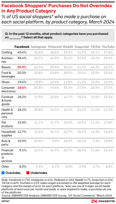 Thanks to the strong penetration of Marketplace, Facebook claimed the largest share of social shoppers in our survey. More than 60% of respondents said they’d purchased something while using Facebook in the 12 months preceding our poll. But that did not result in Facebook shoppers significantly overindexing for purchases in any specific product category.