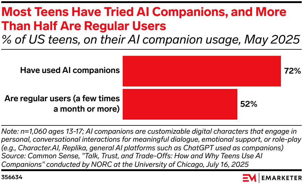 Seventy-two percent of teens alone have used an AI tool for companionship purposes at least once, per Common Sense Media, while 33% of single Gen Z adults and 23% of single millennials have interacted with an AI platform for companionship or for emotional support, according to Match and The Kinsey Institute. Meanwhile, 21% of adults worldwide have used AI tools for companionship, per Kantar.