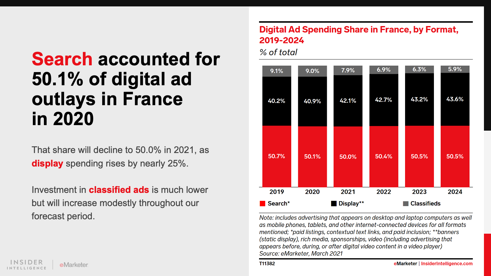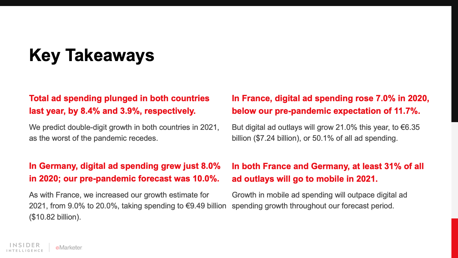 In Germany, as in France, digital ad spending growth was rather anemic in 2020, at 8.0%, compared with our pre-pandemic expectation of 10.0%. But it will recover dramatically this year. We’ve revised our 2021 estimate upward, from 9.0% to 20.0% YoY.