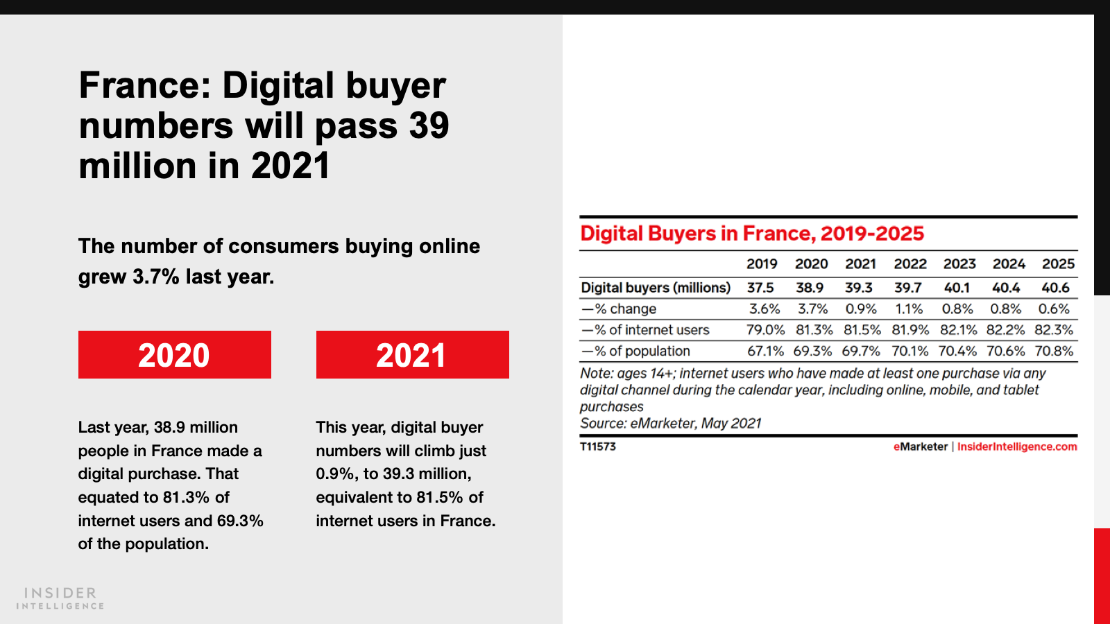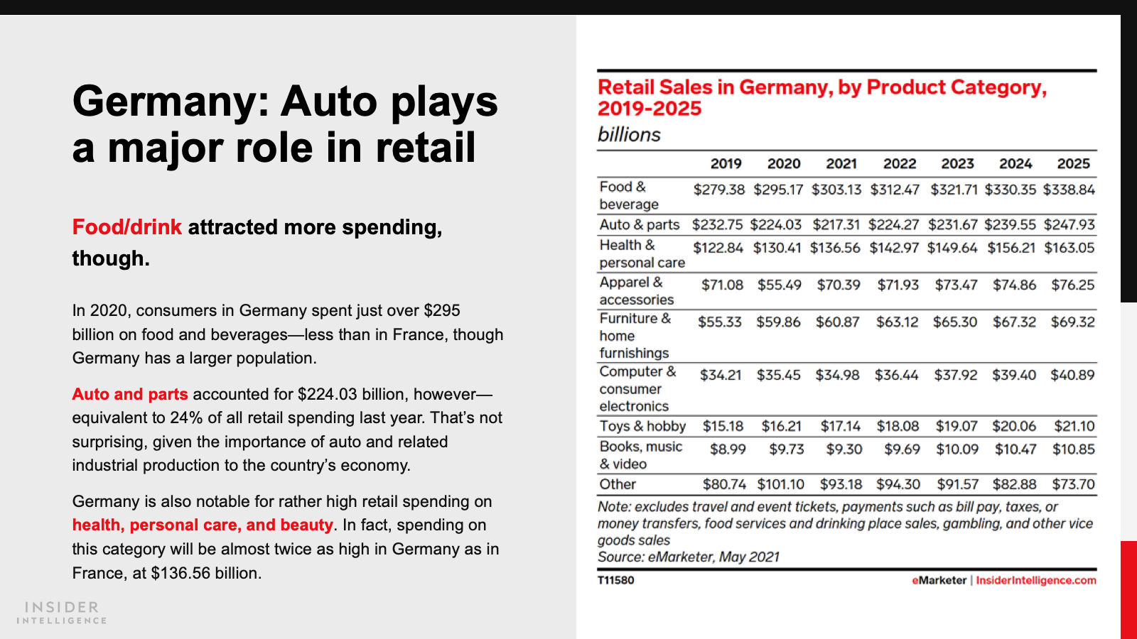 Both countries will pass milestones in 2021, as sales reach $81.03 billion (€71.06 billion) in France and $101.20 billion (€88.75 billion) in Germany. Annual growth rates will decline to single digits this year, as some retail trade returns to physical stores.