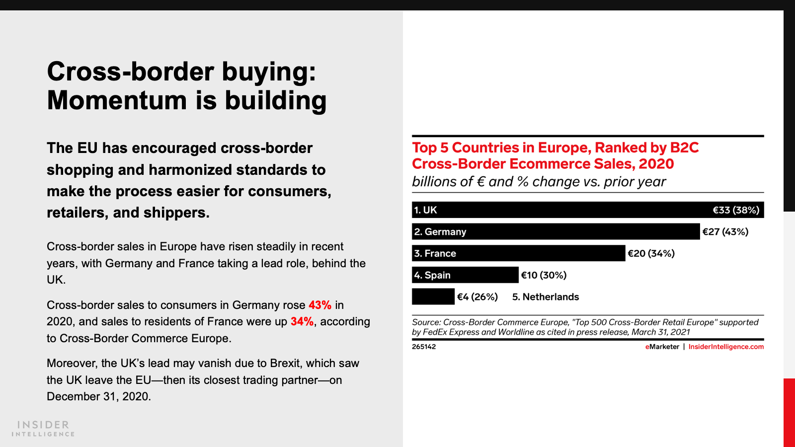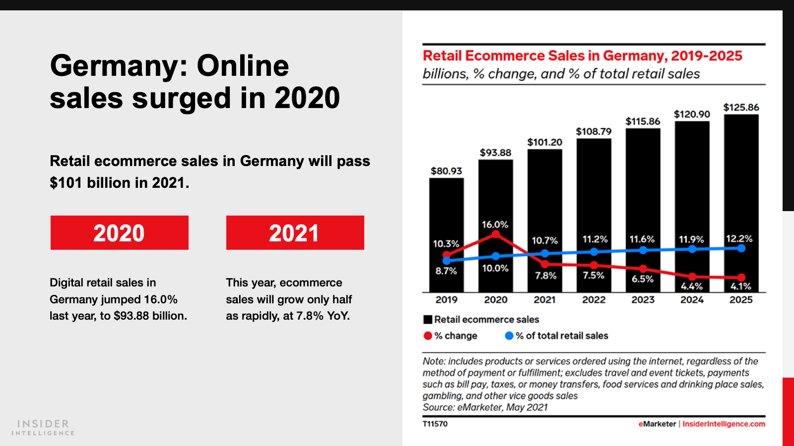 KEY STAT: Across Western Europe, retail ecommerce jumped 29.4% in 2020. This year, France and Germany will both post single-digit gains, with digital sales reaching $81.03 billion (€71.06 billion) and $101.20 billion (€88.75 billion), respectively.