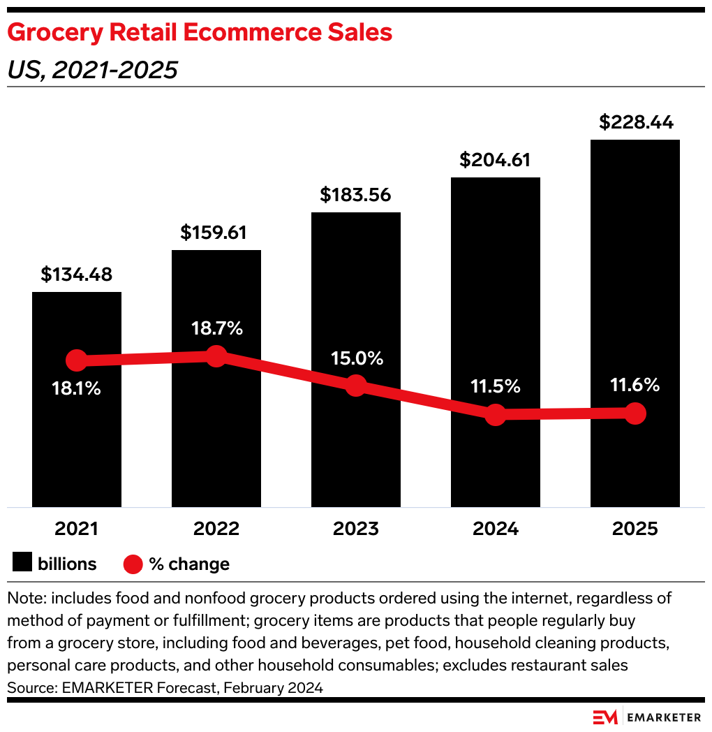 US digital grocery sales will grow 11.5% to reach $204.61 billion this year, according to our forecast. And there’s still a lot of room for growth, as digital grocery will represent just 13.0% of total grocery retail sales in 2024.