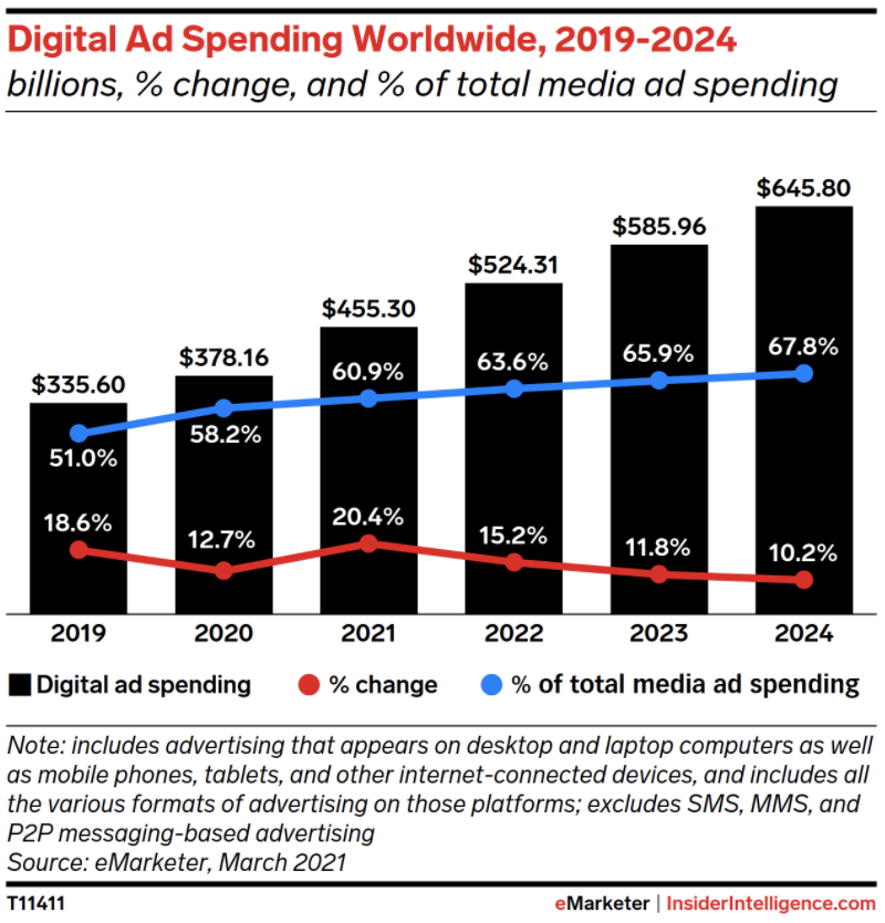 Total media ad spending worldwide will reach $747.67 billion, at a growth rate of 15.0%—the fastest since we began tracking the metric 10 years ago. By the end of 2024, spending will nearly reach $1 trillion. For context, it just crossed the $500 billion mark in 2016.