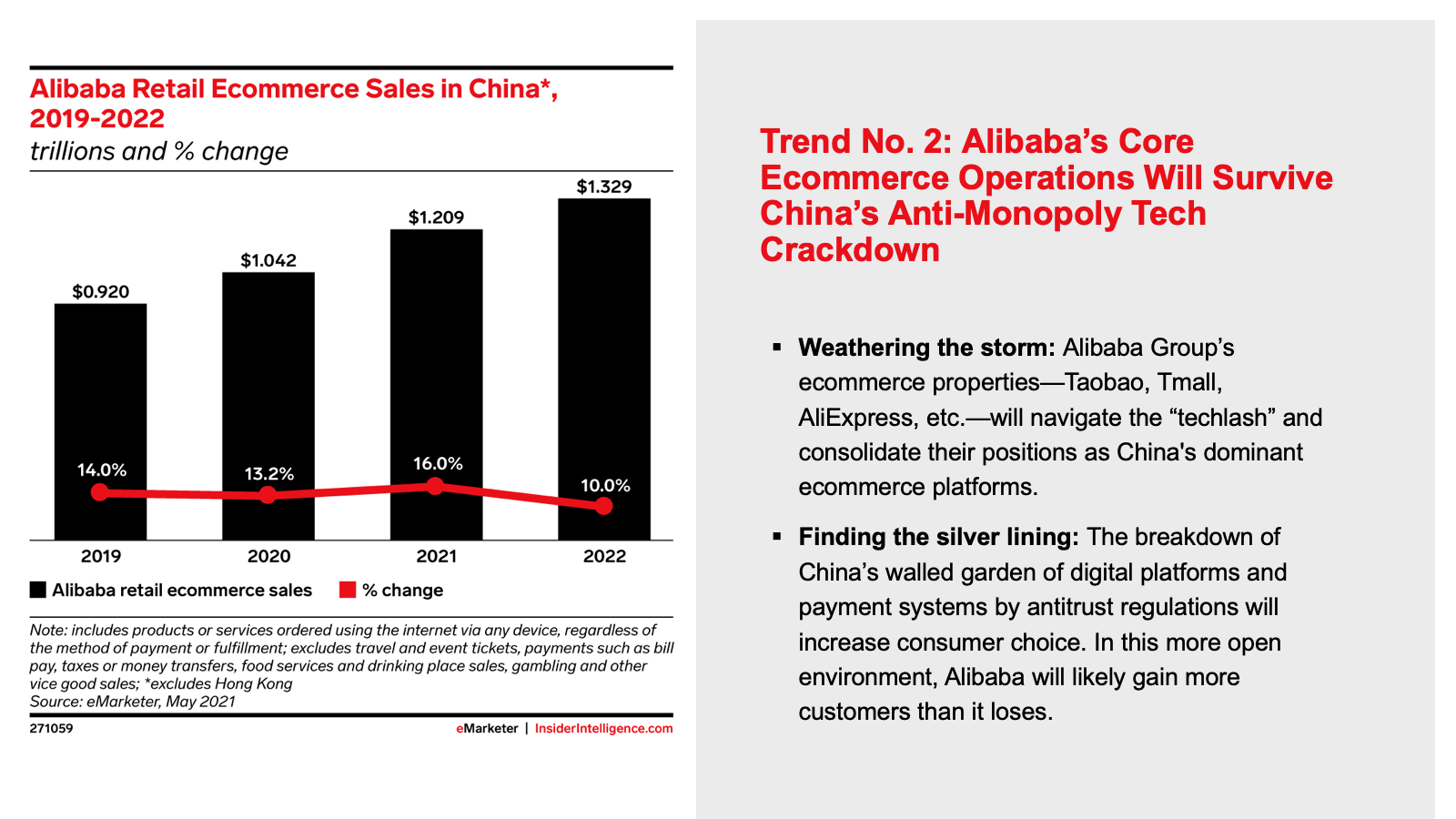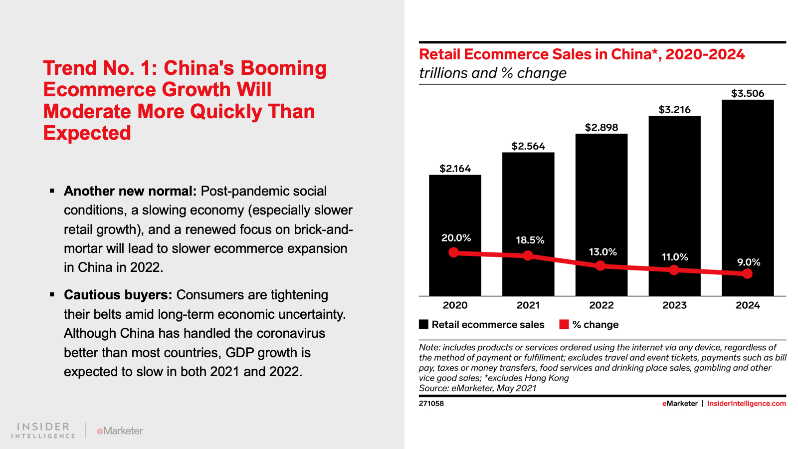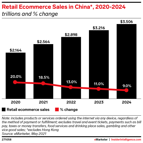 KEY STAT: Ecommerce growth in China will decline to 13.0% in 2022. After a decade of unbelievable expansion in digital shopping, China’s sales increases are expected to settle into globally normal levels going forward.