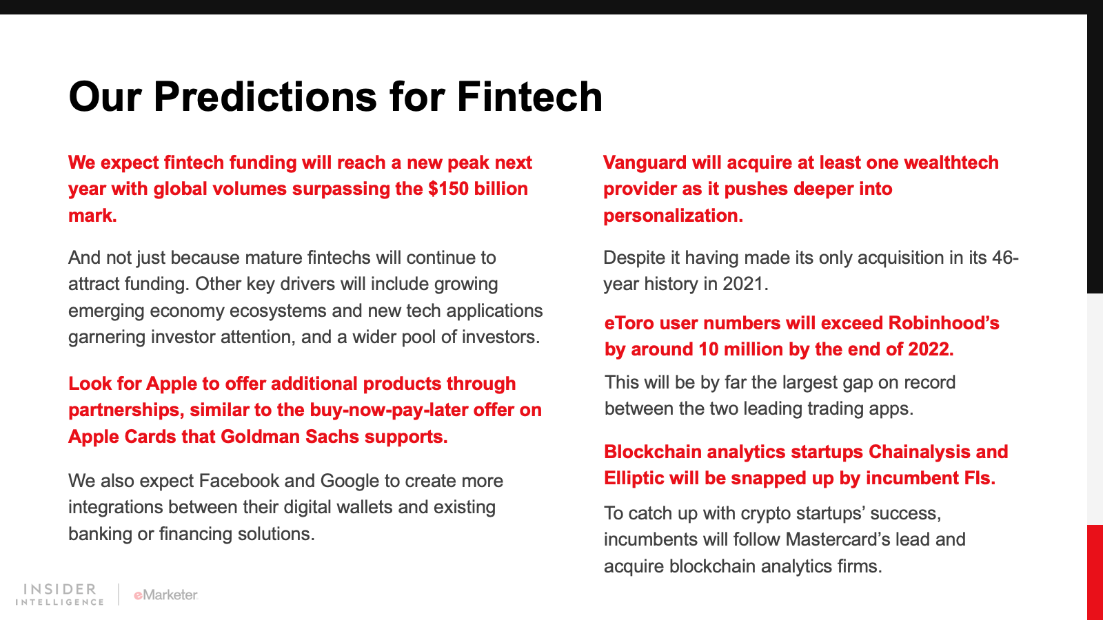 Fintech has reached new heights of funding and adoption, accelerating digital transformation across the financial services industry. Players big and small are scrambling to get ahead of the trends that will make or break growth in the coming year.