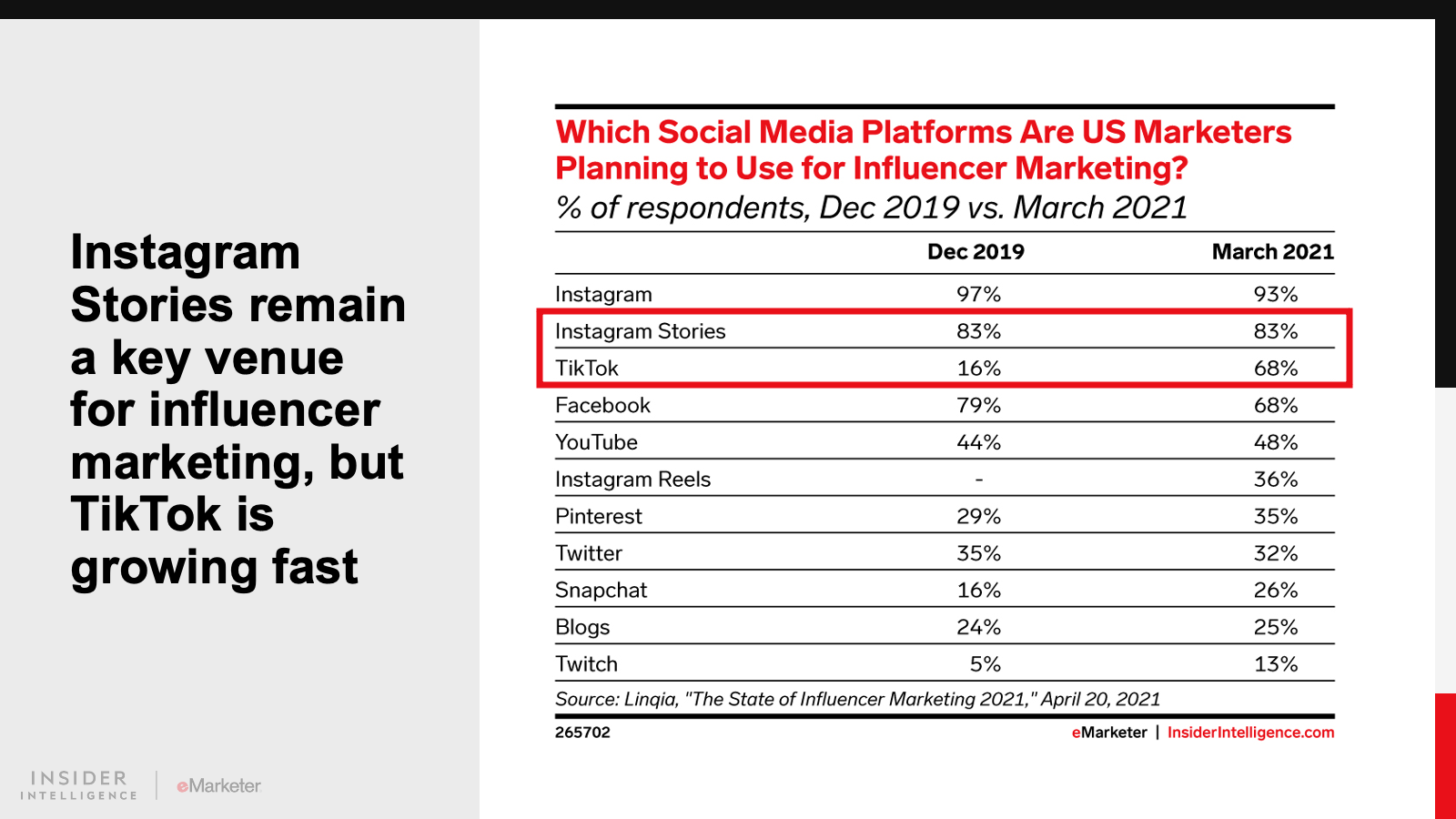 KEY STAT: Instagram Stories are still highly popular for influencer marketing, according to US marketers surveyed by Linqia in March 2021. Most expected to use the format, even as the percentage of those planning to use TikTok more than quadrupled since December 2019.