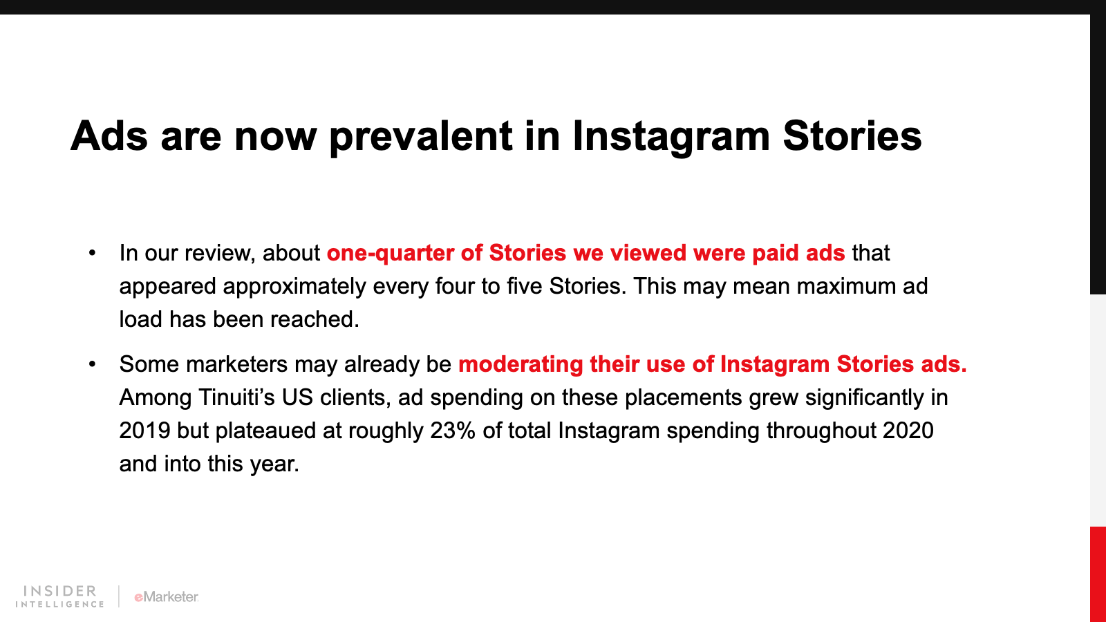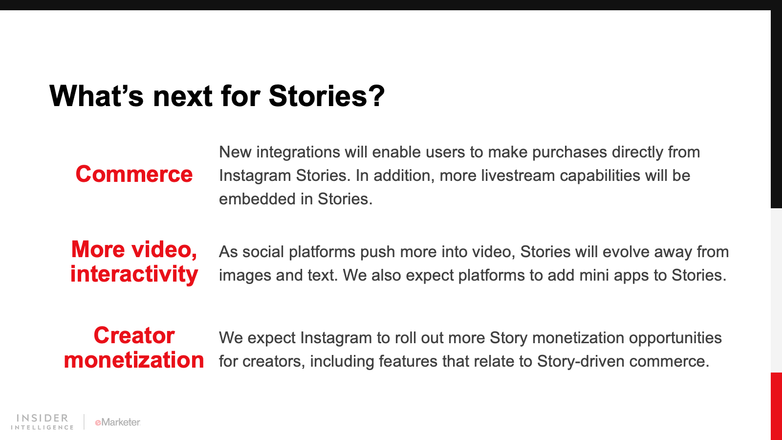 We expect Instagram and its siblings will bring more social commerce features to Stories. We also foresee more video and interactivity. The rise of short-form video is something to keep an eye on, but we believe the uniqueness of the Story format will help it solidify its place as an important venue for social media marketing.