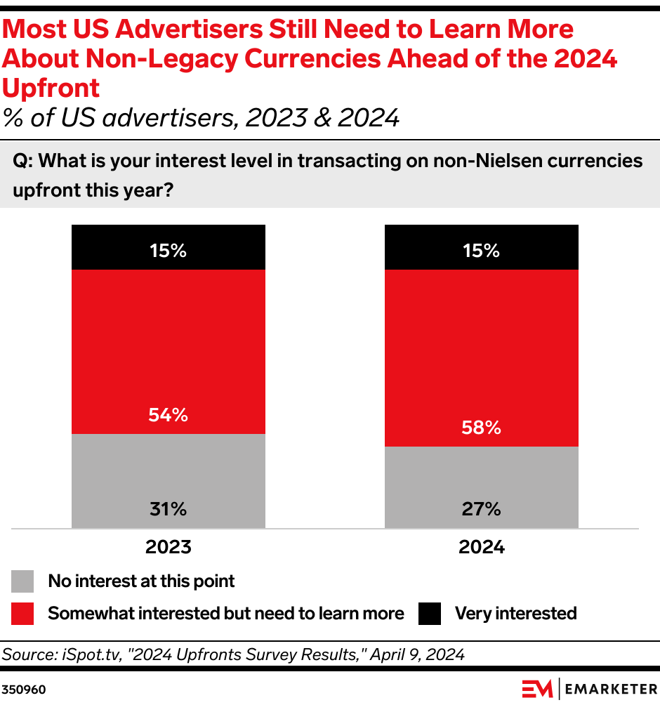 Key stat: Interest in non-legacy currencies is up slightly, but 58% of US advertisers say they still need to learn more about them before putting them into action, according to an April 2024 survey from iSpot.tv.