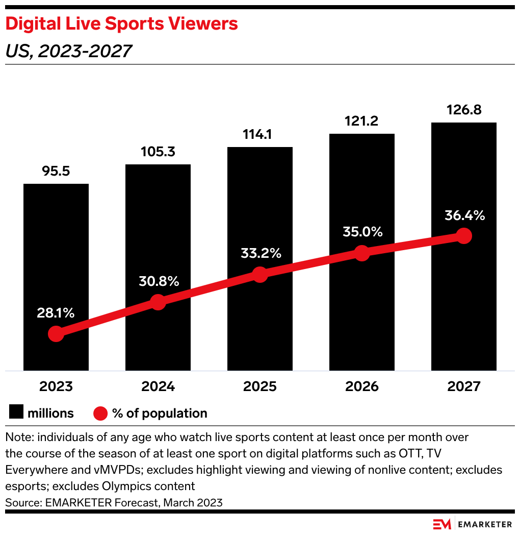 The opportunity in sports streaming: Sports helps streamers gain new customers. Peacock’s previous exclusive NFL event drew 3 million sign-ups, per Antenna data, with 71% still subscribed by the end of February.