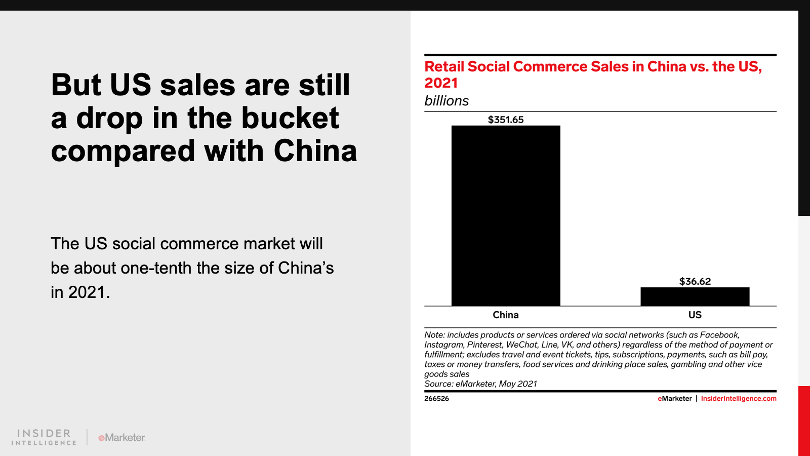 KEY STAT: US retail social commerce sales will reach $36.62 billion in 2021, but that’s still about one-tenth the size of China’s social commerce market.