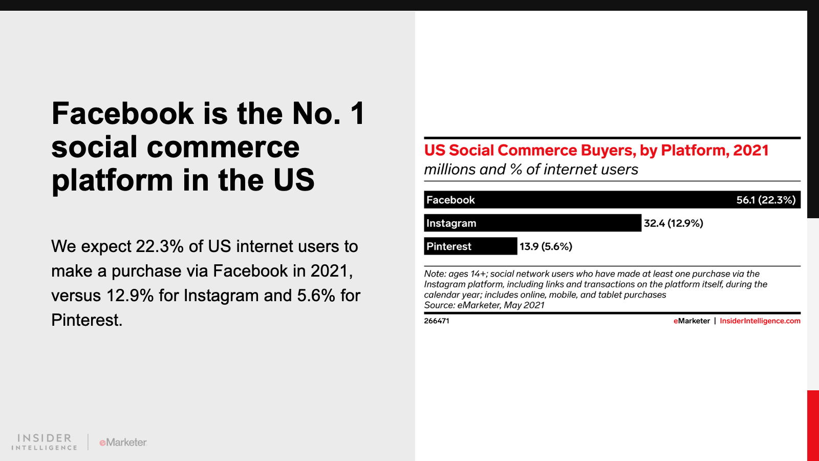 Facebook is the top social commerce platform in the US, with 56.1 million buyers in 2021, according to our inaugural forecast. Instagram is in second place, with 32.4 million, followed by Pinterest, with 13.9 million. WeChat dominates the social commerce space in China, though group-buying apps like Pinduoduo have also driven its growth.