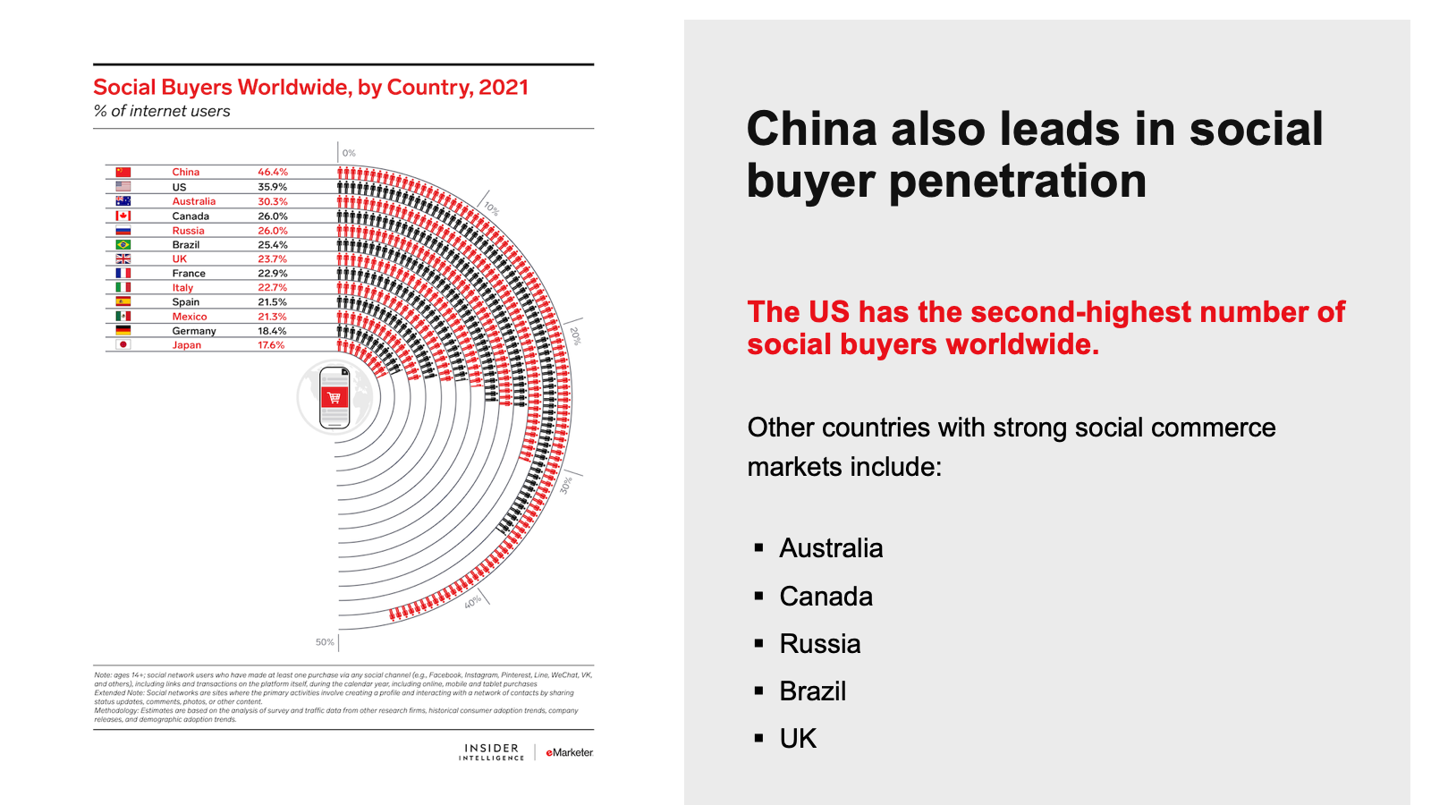 WHAT’S IN THIS REPORT? This report explores our latest forecasts for social commerce sales in the US and China, and how much marketers can look to China as a case study for social commerce’s development in the US. It also includes our forecasts for social buyers in 13 markets worldwide.