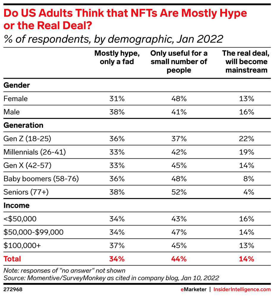 The big takeaway: NFTs and blockchain have real-world uses in financial services that major banks are now exploring—whether as part of a marketing strategy, to assert themselves as digital innovators, or because they want to expand their presence in asset management. FIs should think seriously about whether a division within wealth management should develop expertise in NFTs, or if they should build relationships around services targeting token owners, similar to those they've developed with the industry that serves collectors of fine art, antiques, and high-end collectibles.