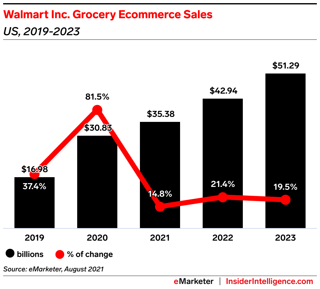 • The situation has helped Walmart gain market share in grocery, which is its top sales category, per CNBC. While that suggests Walmart may be attracting more grocery shoppers, in the short term those low-margin sales pressure its profits.