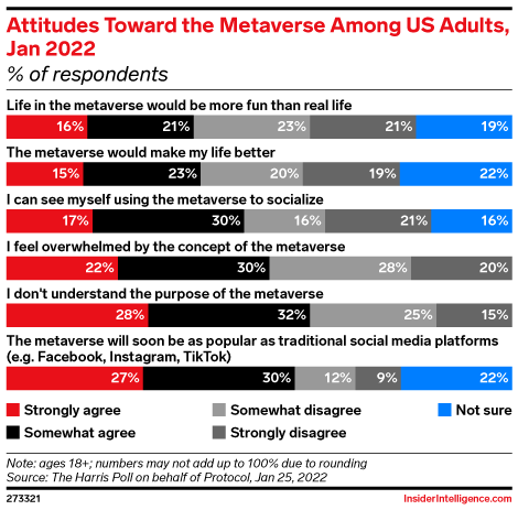 KEY STAT: Some 60% of US adults either strongly or somewhat agreed with the statement “I don’t understand the purpose of the metaverse,” according to a January 2022 survey from Protocol and The Harris Poll. However, nearly as many agreed that the metaverse will soon become as popular as traditional social media platforms.