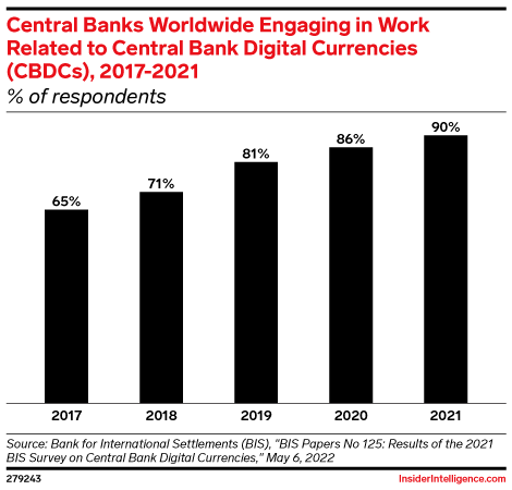 KEY STAT: Countries don’t want to be left out of the CBDC rat race: Of the 81 central banks surveyed by the Bank for International Settlements (BIS) in fall 2021, 90% said they were exploring CBDCs.