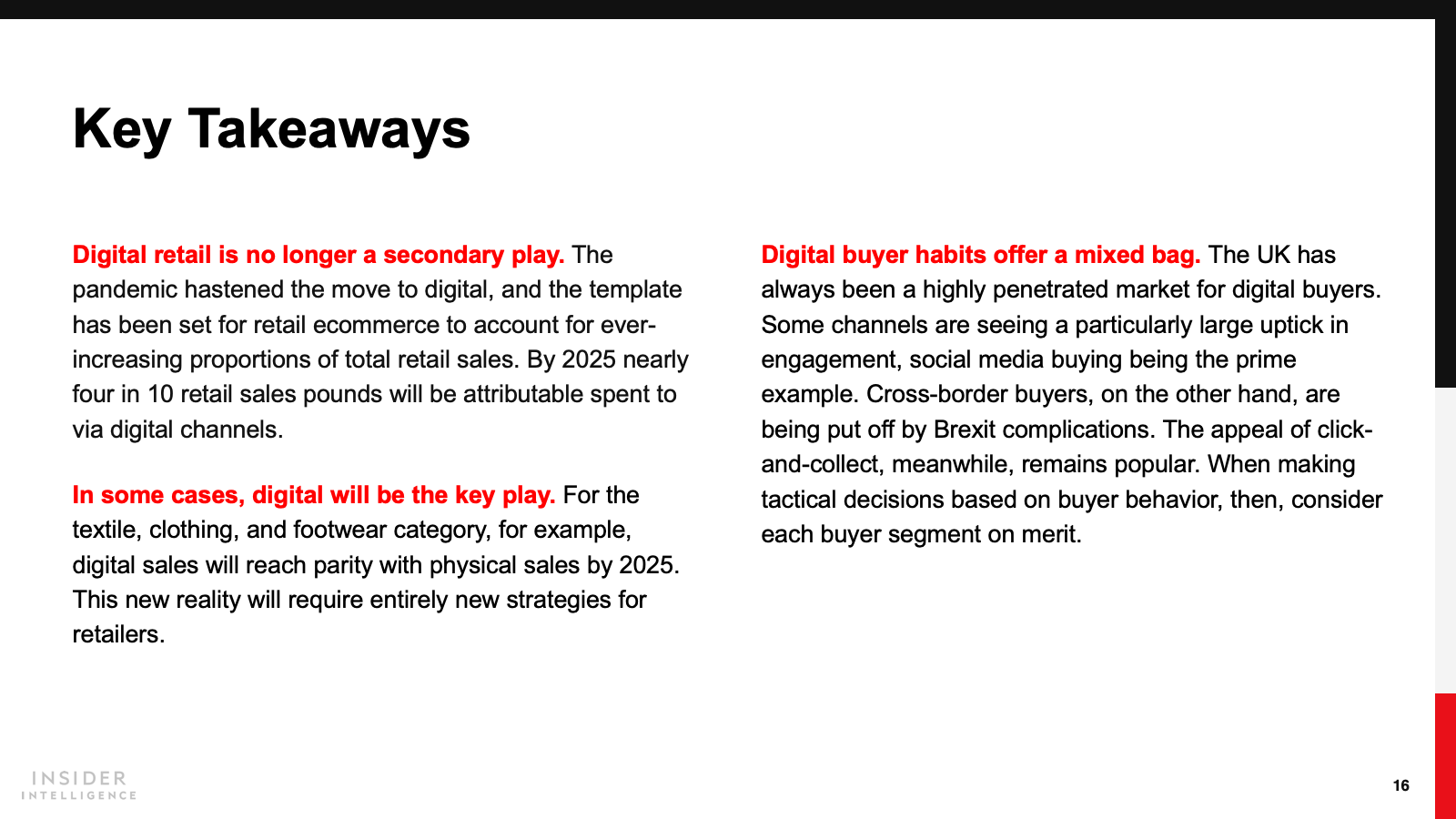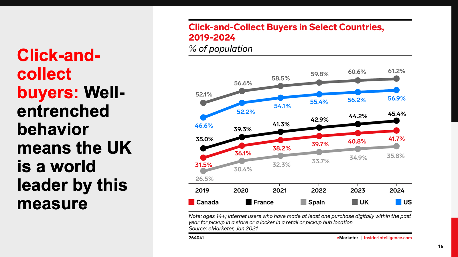 The UK already has a high number of digital buyers, but social media buying is not yet commonplace. That will begin to change, though, as more people buy via social channels. Cross-border buyer numbers will dip, as Brexit concerns take their toll. The number of click-and-collect buyers, meanwhile, will remain strong, underpinned by a mature grocery sector.