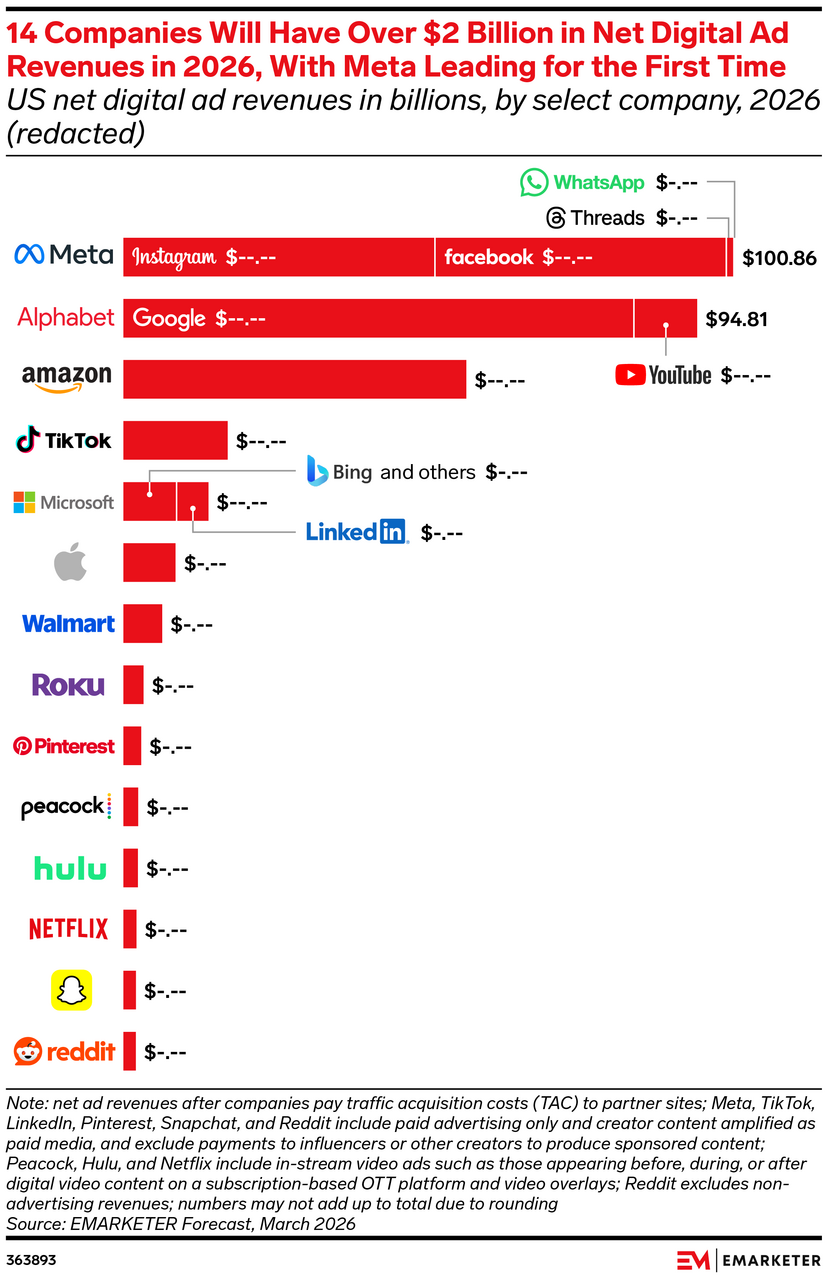 Key Stat: The Meta family of apps will produce $100.86 billion in net digital ad revenues in the US in 2026, putting Meta ahead of Google on a net basis for the first time.