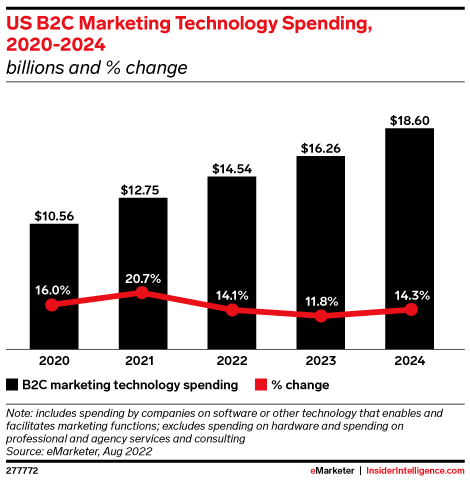 Marketing technology (martech) represents a strategic investment for business-to-consumer (B2C) brands aiming to engage and build relationships with individuals. Despite a post-pandemic dip in growth rate, robust spending will lead to a $14.54 billion market in 2022.