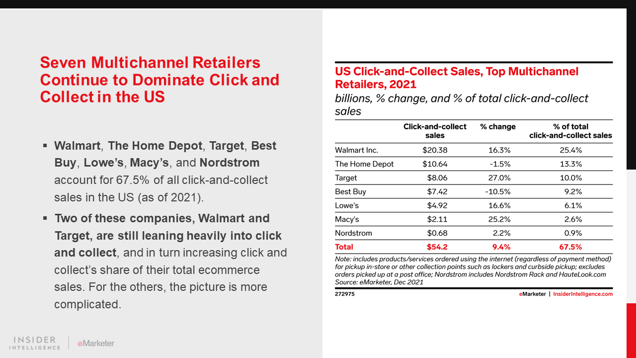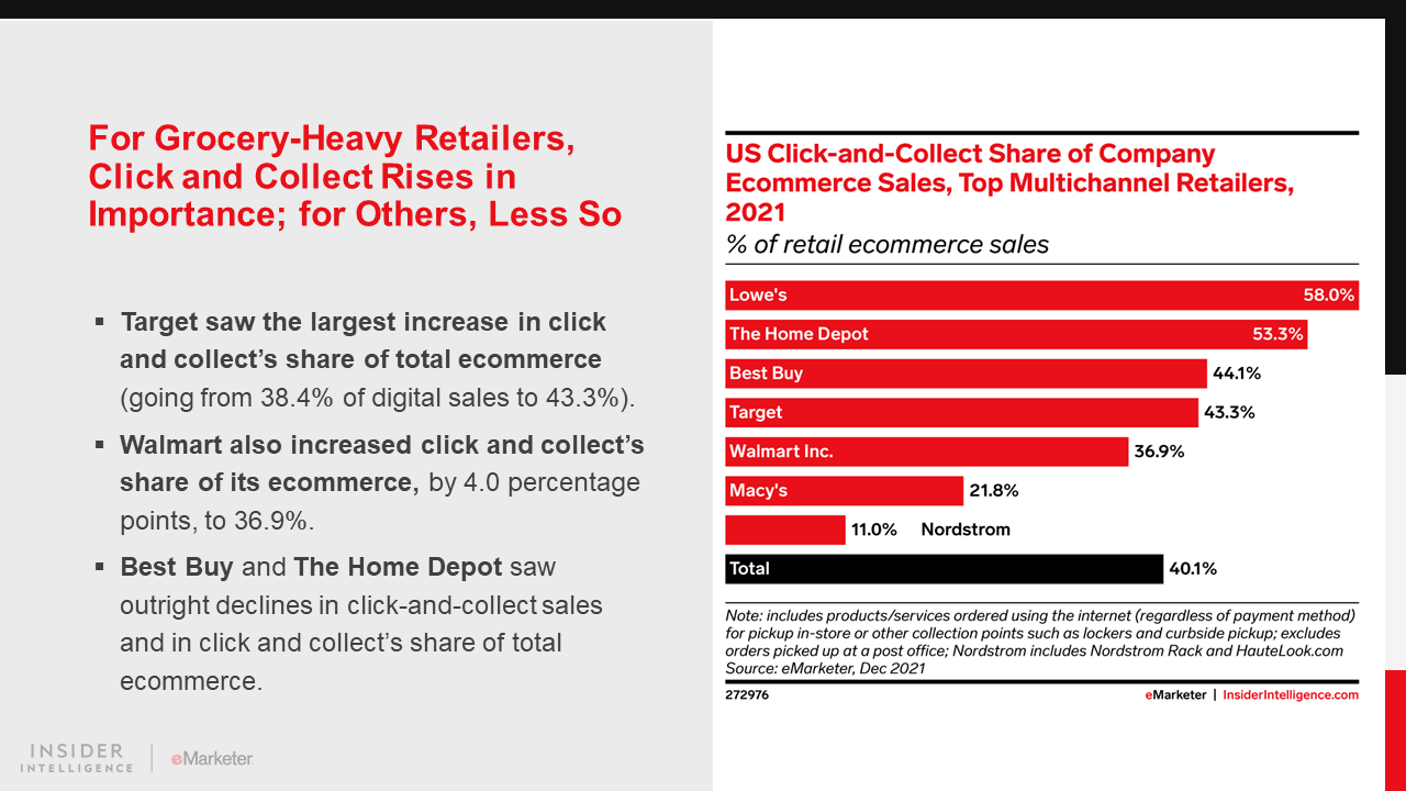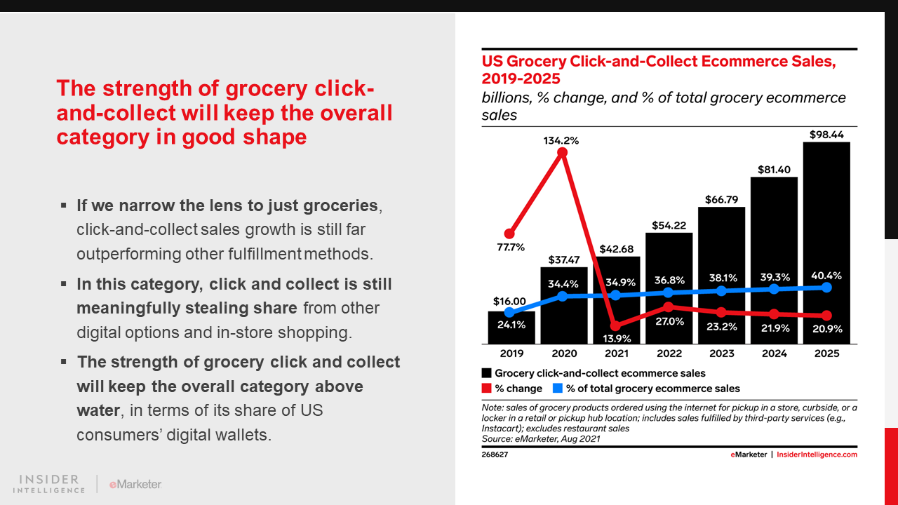 KEY STAT: US buyers will spend $95.87 billion via click and collect this year, a 19.4% increase year over year (YoY). However, the fulfillment option’s surprisingly sluggish 2021 means spending is well below what we anticipated.