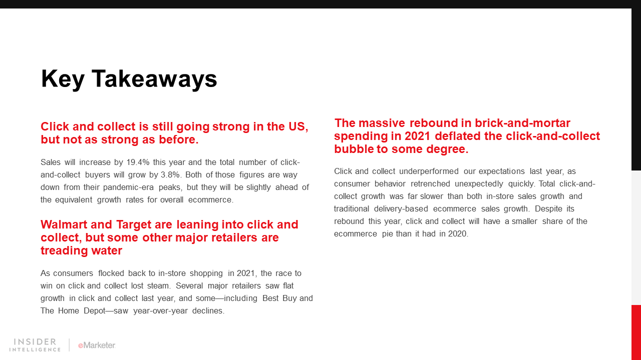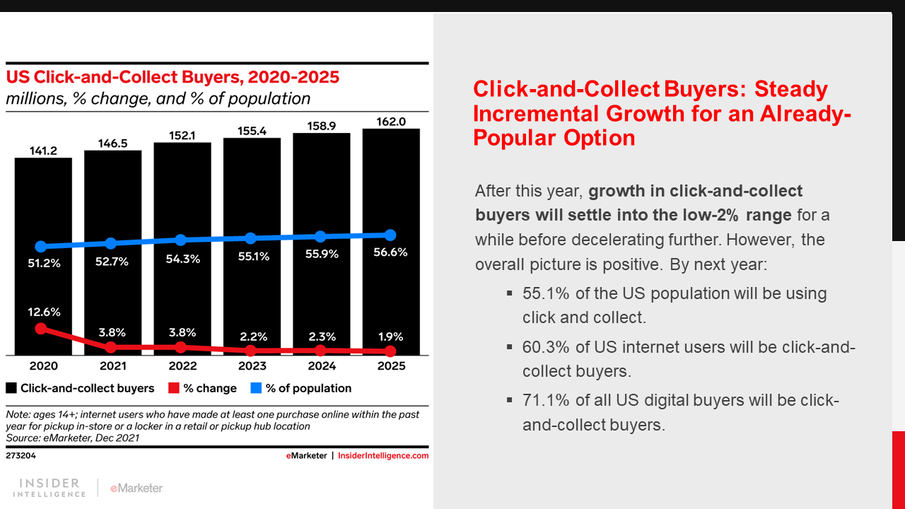 Click and collect is set for a strong year in the US, both in terms of sales growth and increases in total buyers. However, the era in which click-and-collect options were dramatically shifting the dynamics of both ecommerce and in-store shopping appears to have ended.