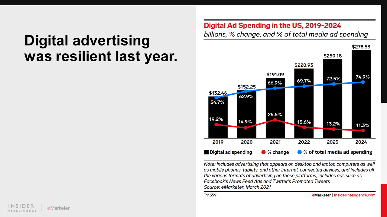 KEY STAT: US advertisers increased their spending on digital ads last year by almost 15% despite the pandemic—and growth will accelerate this year as digital surpasses two-thirds of the US ad market.