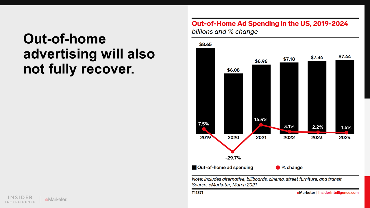 TV and out-of-home (OOH) ad spending will increase this year after sharp declines in 2020—but neither medium will reach its previous peak again. Other traditional media, including print, radio, and directories, will continue their yearslong declines.