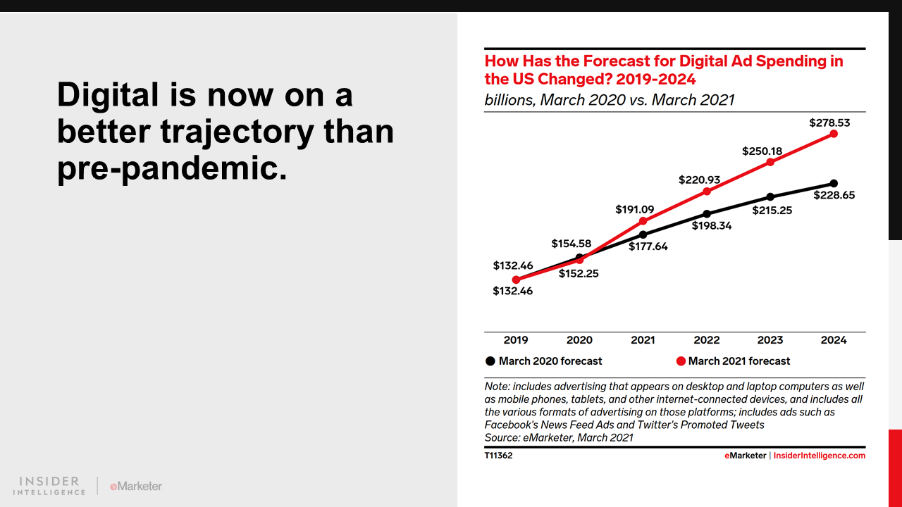 One of the pandemic’s overarching effects was accelerated digital transformation across the economy and society. A steep increase in the amount of retail sales transacted digitally buoyed digital ad spending last year and boosted digital advertising’s long-term prospects.