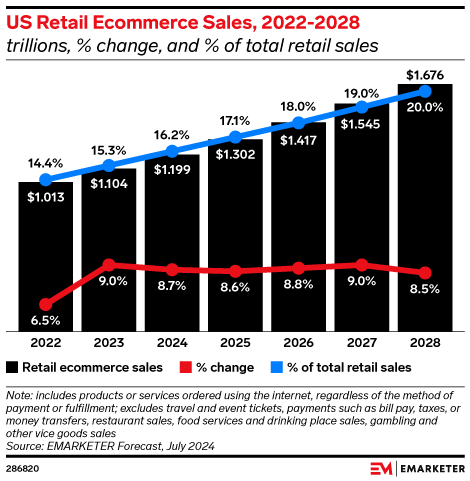 Key Stat: US ecommerce sales will grow by 8.7% in 2024 to nearly $1.2 trillion, comprising 16.2% of total retail sales.