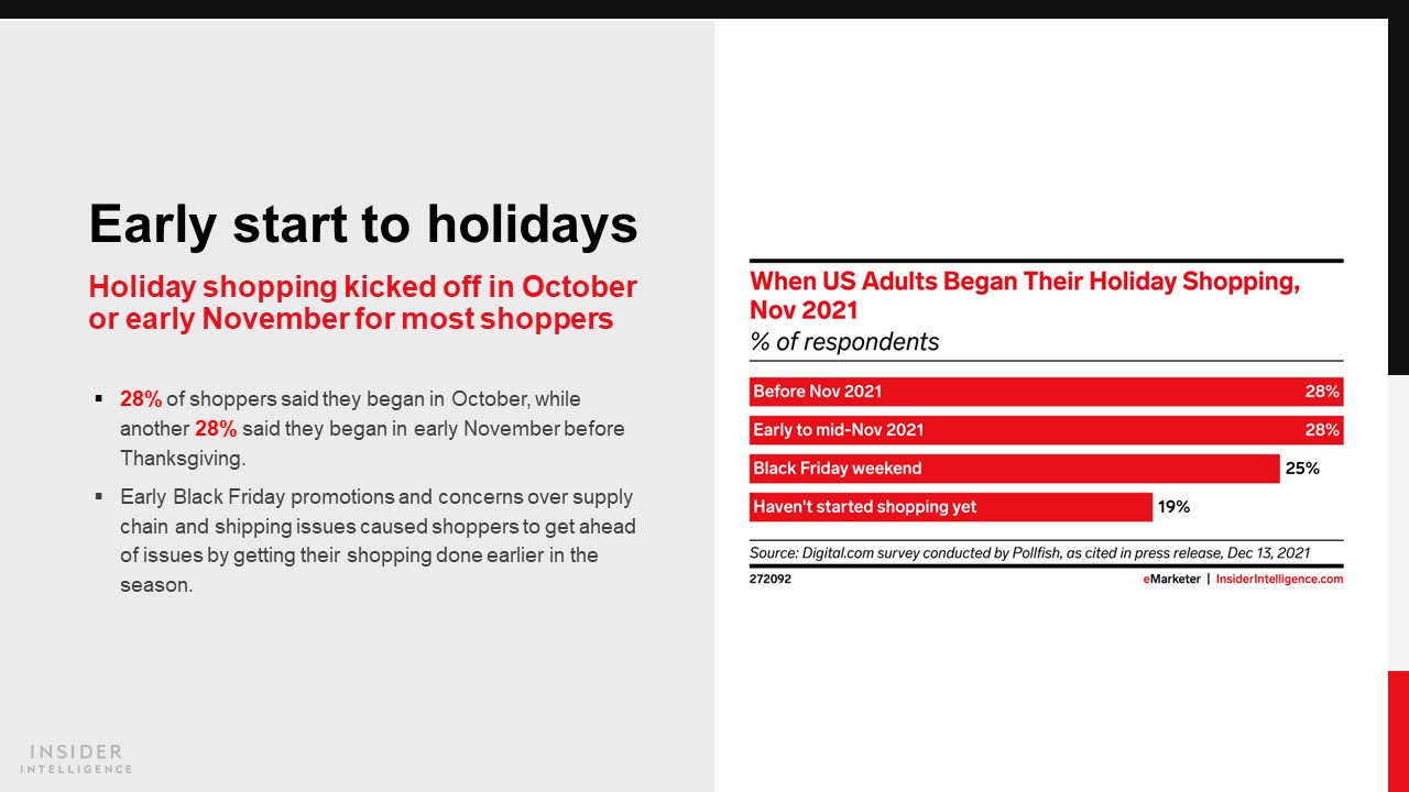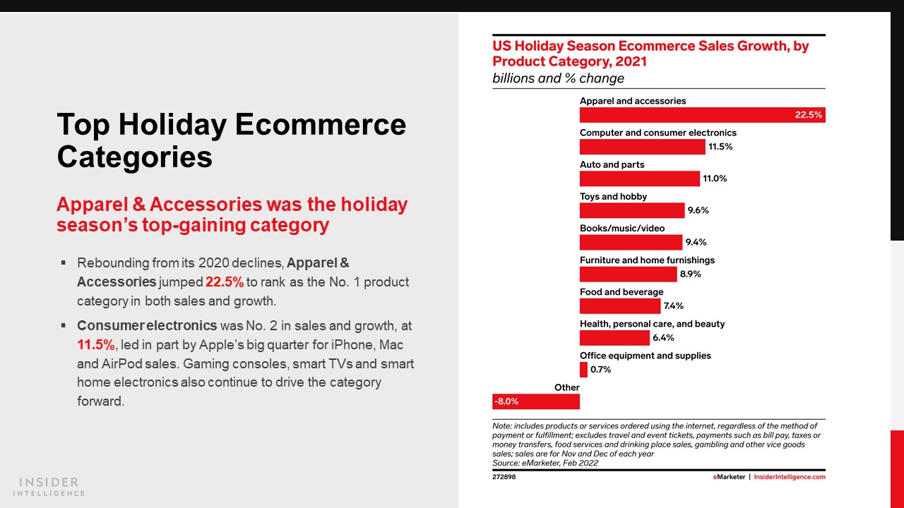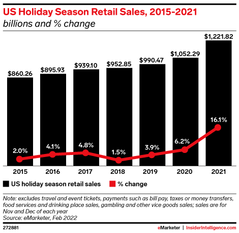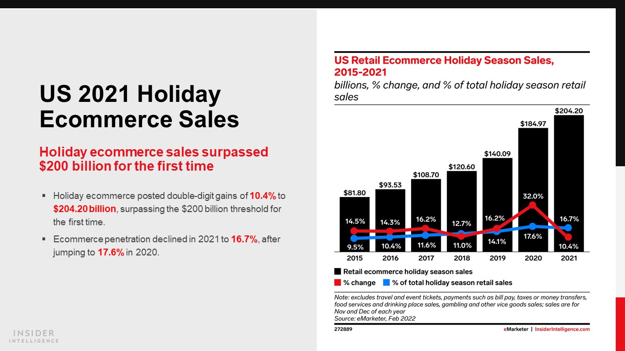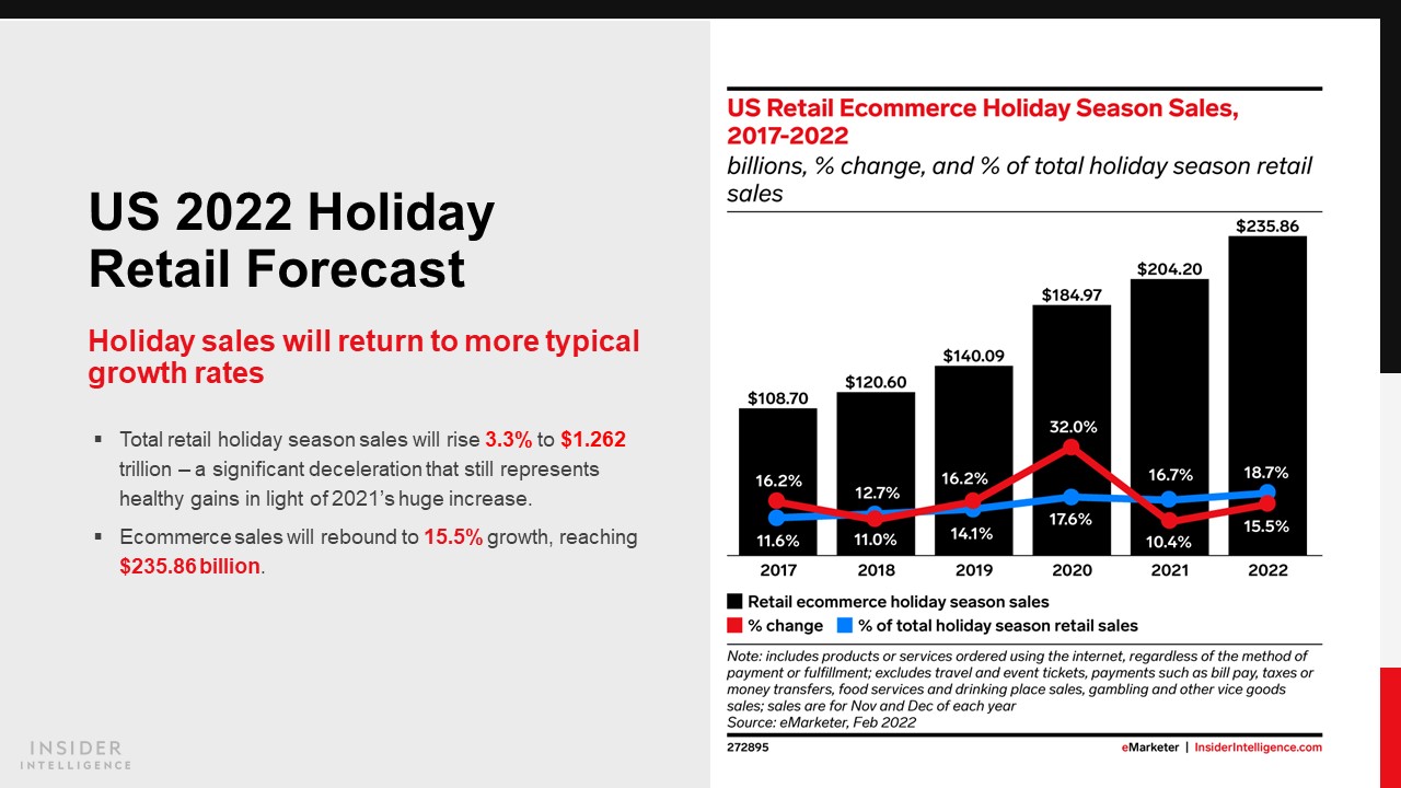 WHAT’S IN THIS REPORT? A review of the 2021 US holiday season and an early preview of the 2022 holidays, including our latest US retail and ecommerce spending forecast.