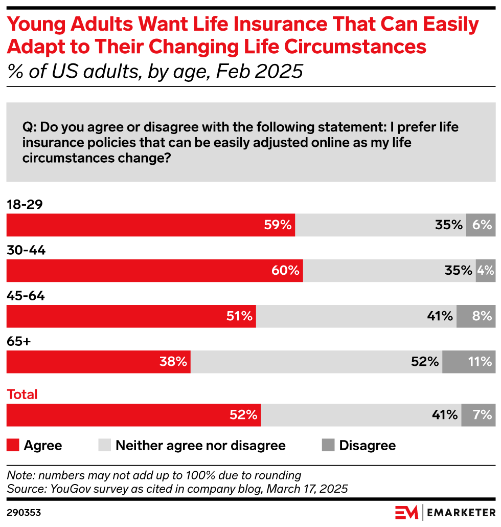 Key Stat: Sixty percent of US 30- to 44-year-olds and 59% of 18- to 29-year-olds want life insurance they can easily adjust online as their life circumstances change, per a February 2025 YouGov survey. To meet this demand, life insurers will need to think beyond traditionally static products.