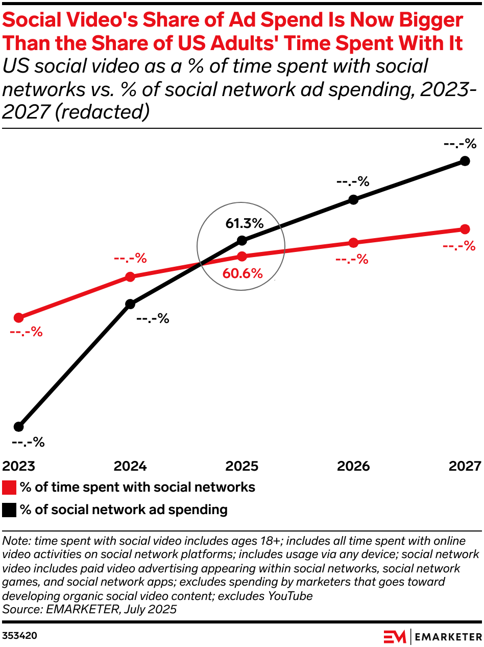 Key Stat: Advertisers will dedicate 61.3% of their social network ad spend to social video this year, surpassing the share of time spent with social video (60.6%) among US adults.