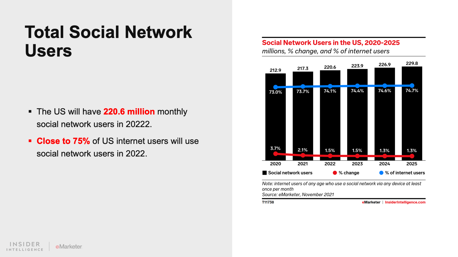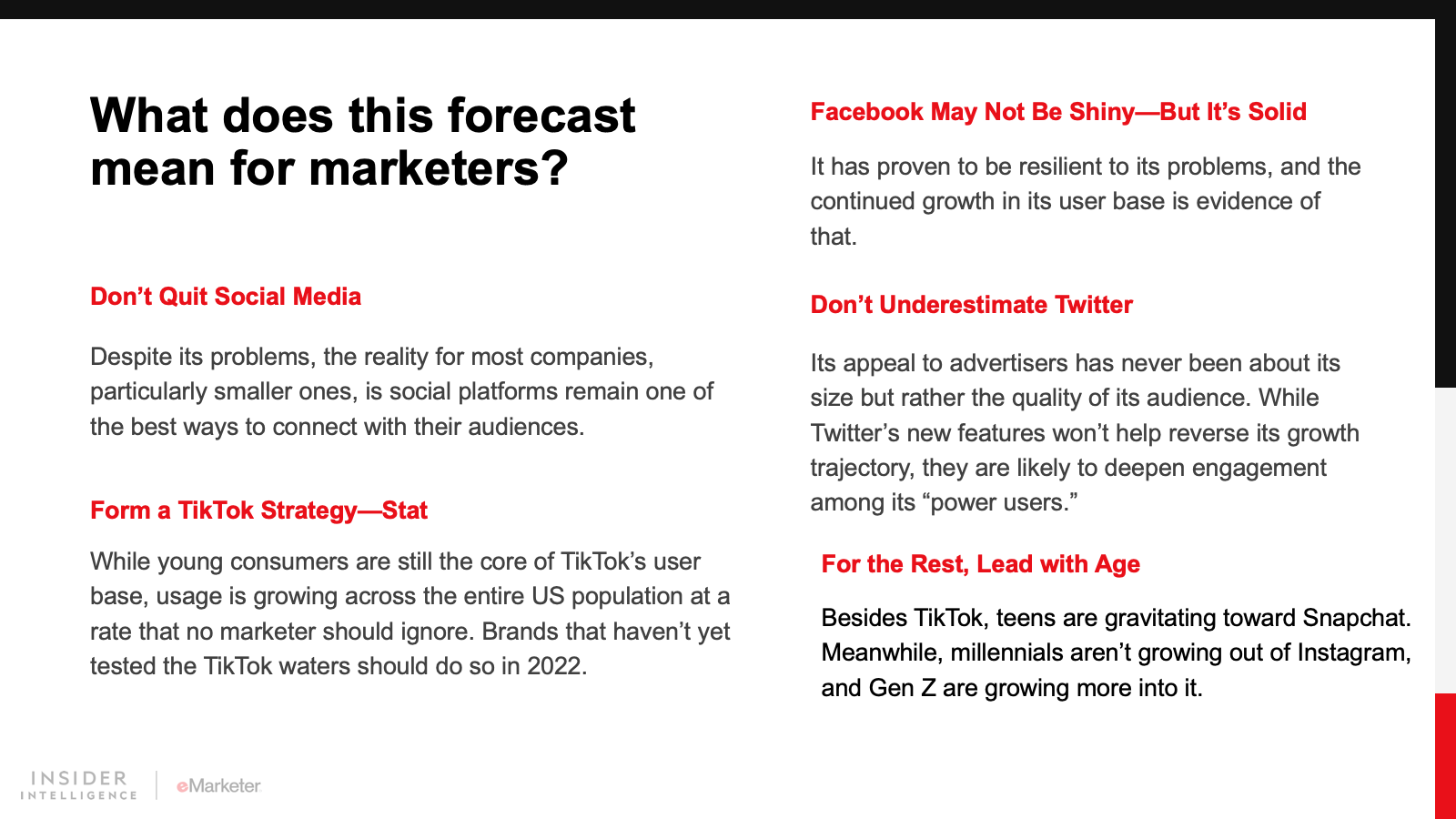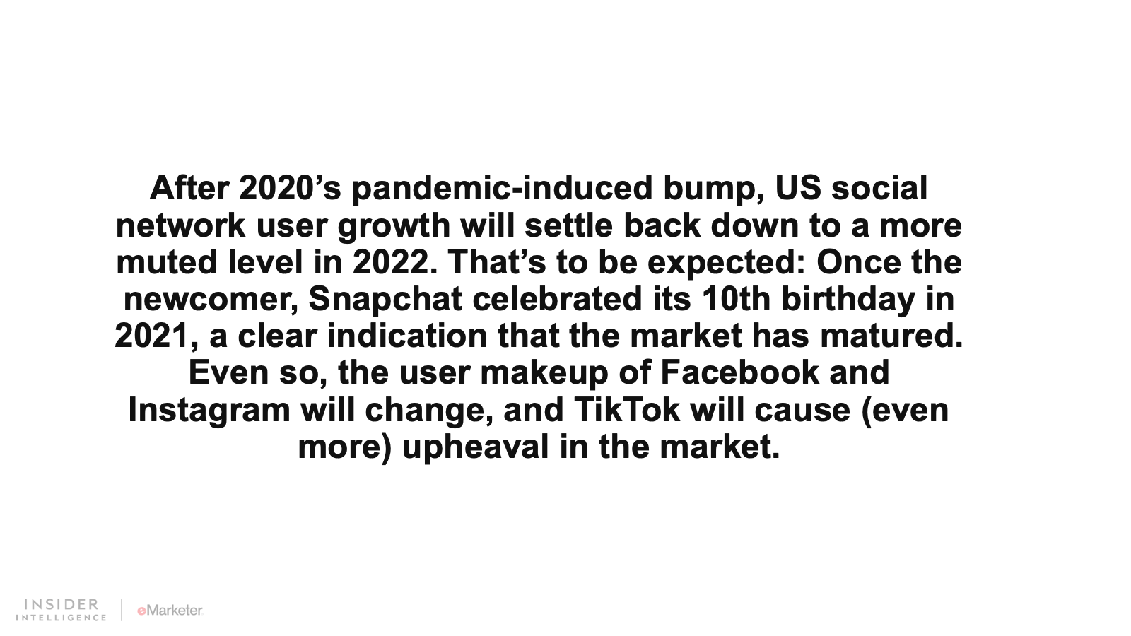 After two years of unexpected gains, US social network user growth will slow to a more pre-pandemic rate in 2022. But important age-related shifts in usage will change the user makeup of Facebook and Instagram, while TikTok will cause (even more) upheaval in the market.
