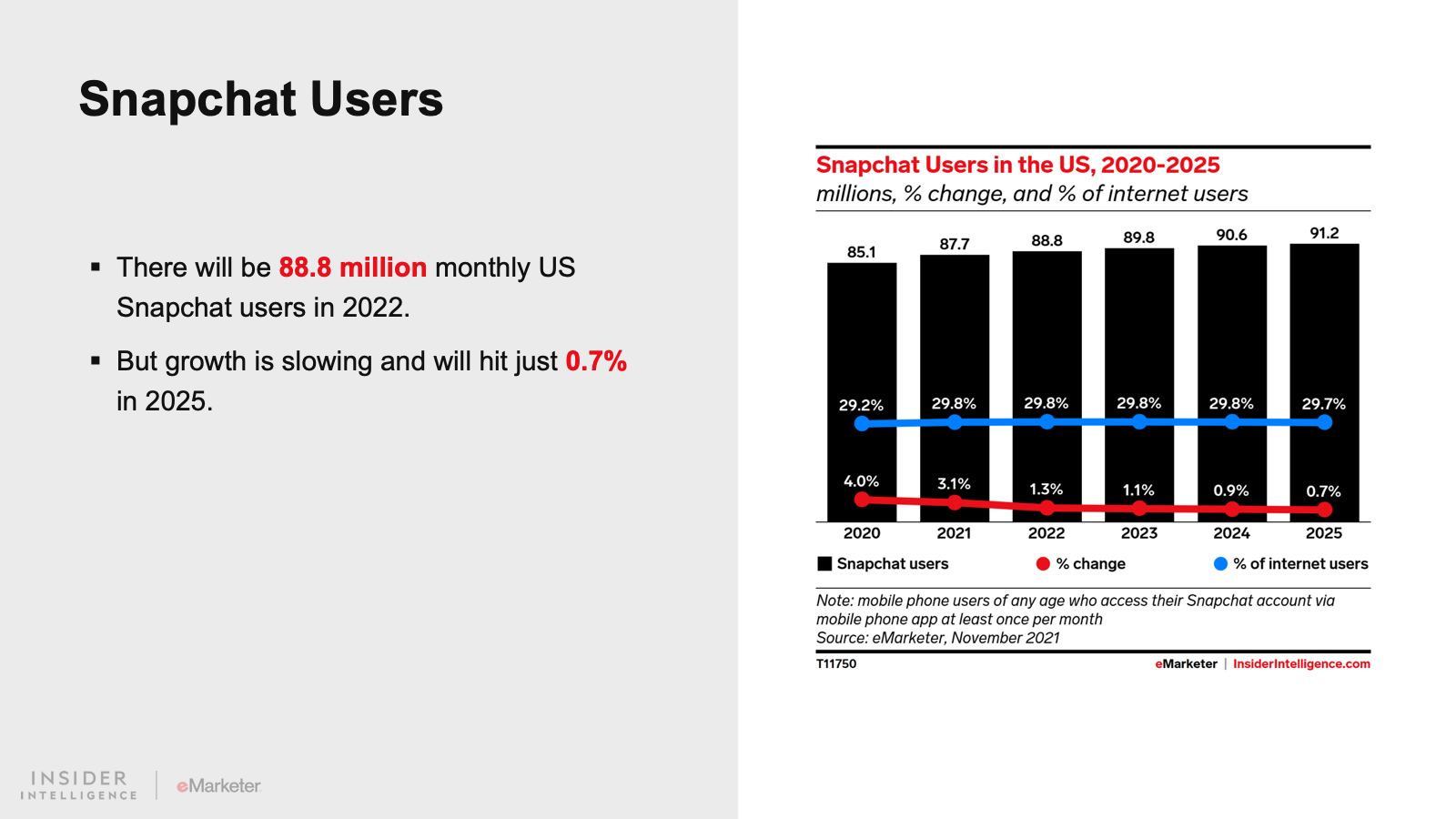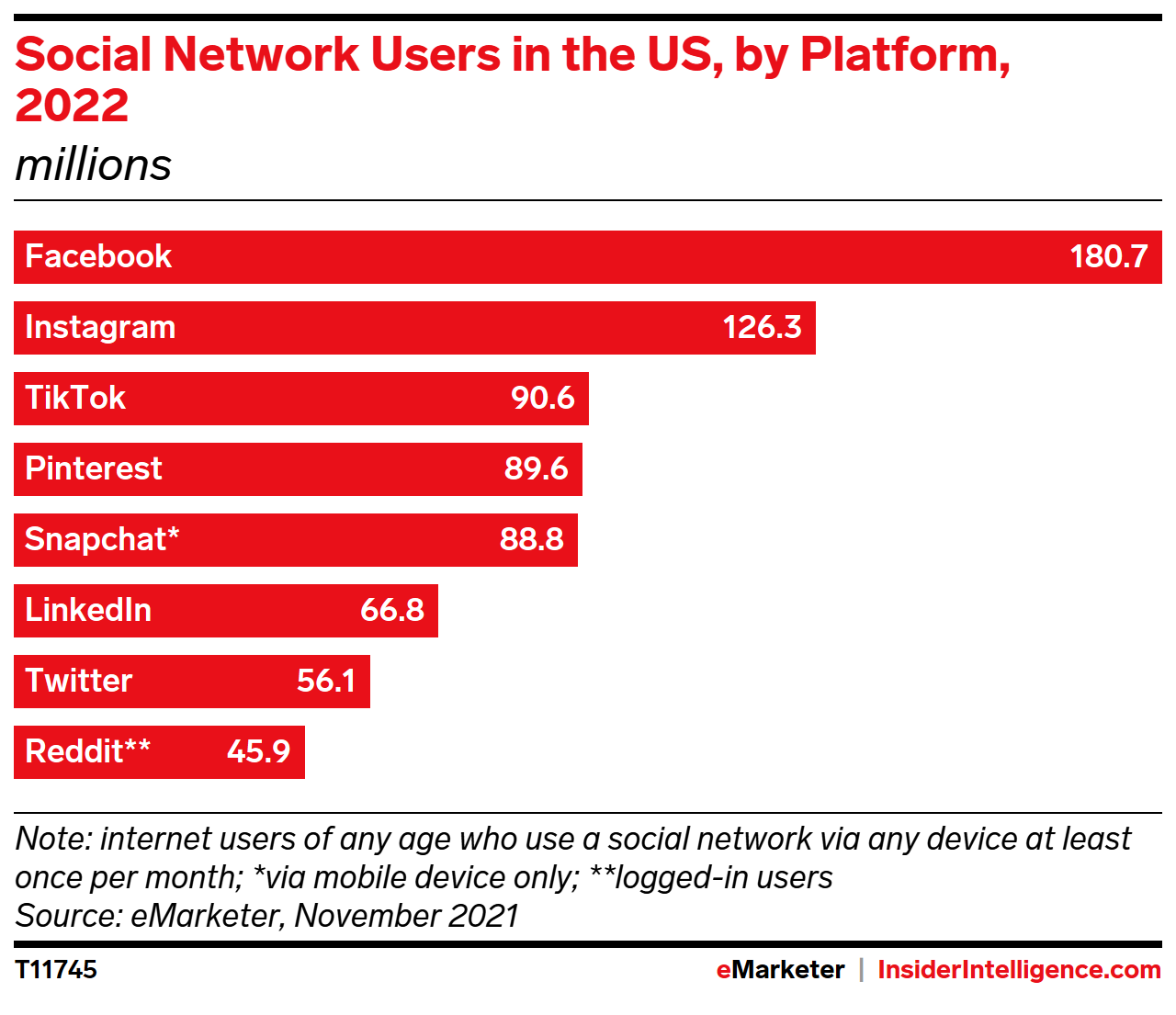 KEY STAT: TikTok will have 90.6 million monthly users in 2022, surpassing Snapchat users and Pinterest users but significantly behind Instagram and Facebook.