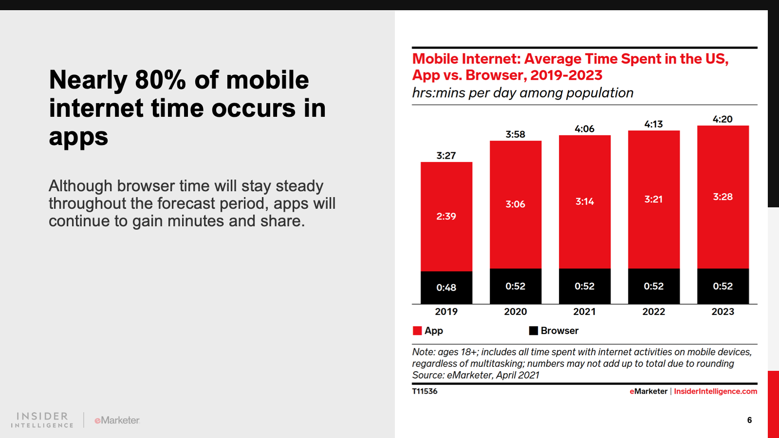 KEY STAT: The average time spent with mobile increased by 31 minutes in 2020 to reach 4 hours and 16 minutes for US adults—and the gains are sticky. Growth will slow this year, but from a much higher baseline.