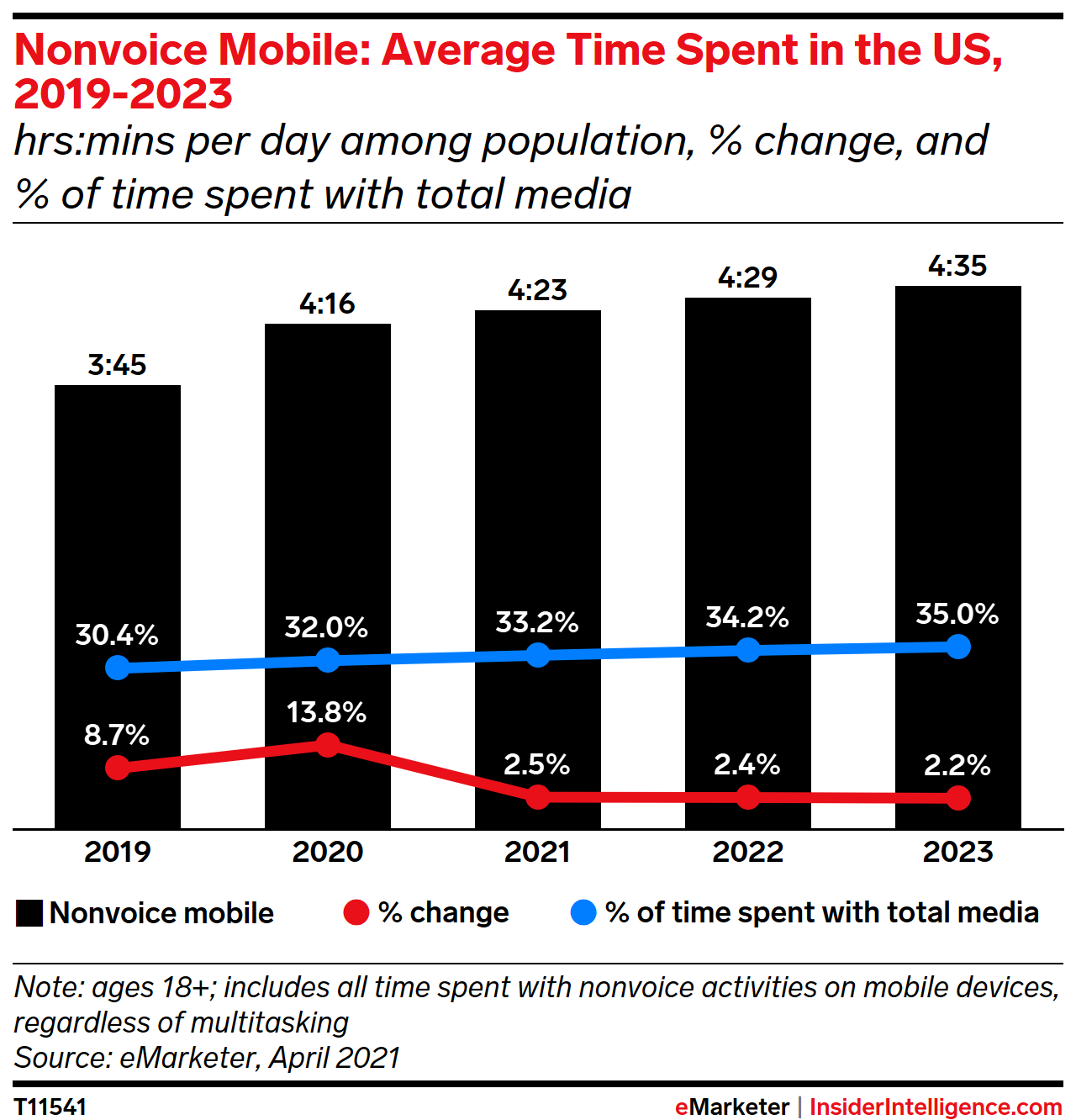 As the US begins to emerge from the coronavirus pandemic, Insider Intelligence expects growth in mobile time spent to slow. This year’s relatively slow growth follows the huge move toward mobile in 2020, when the pandemic accelerated long-term trends of increased time spent with most mobile behaviors. Nearly a third of all media time will be on mobile this year.