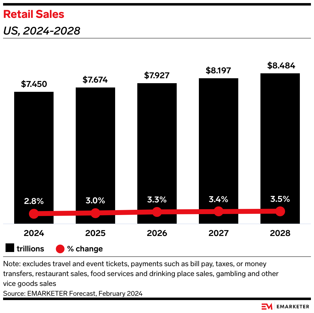 • Our forecast expects US retail sales to grow by 2.8%, an acceleration from last year’s 2.1%.